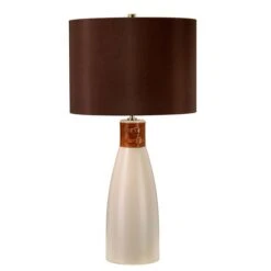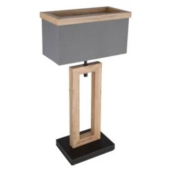 Tischleuchte, Holzdetails, Metall, Glasschirm, Schwarz Amber