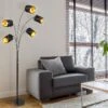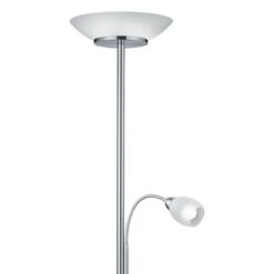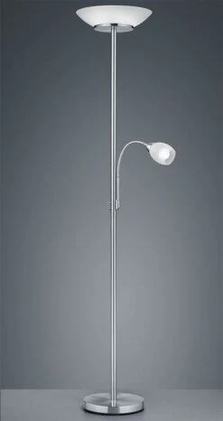 Idealerweise findet die Leuchte ihren Platz neben dem Sofa, denn für ein bestmögliches Lichtergebnis sorgt neben dem Deckenfluter als Hauptlichtquelle ein flexibler Lesearm. Dieser lässt sich gezielt ausrichten, sodass der gewünschte Lichtfall frei gewählt werden kann. Der Fluter hat eine Höhe von 180 cm und einen Durchmesser von 34 cm. Dank der klassischen Farbgestaltung in Nickel matt kann die Leuchte mit vielen Einrichtungsstilen kombiniert werden.