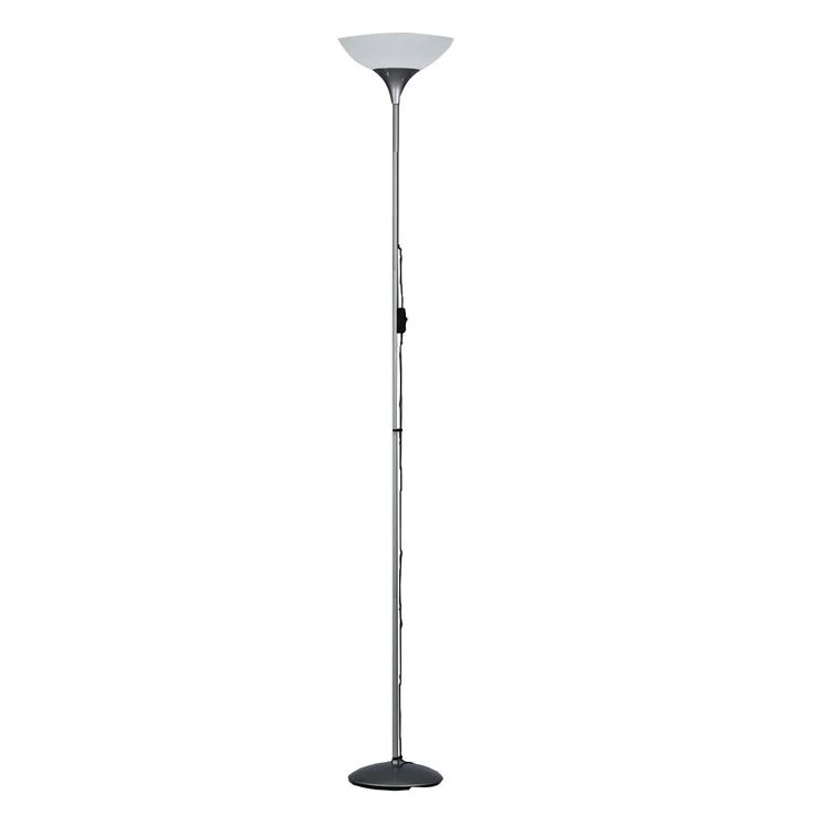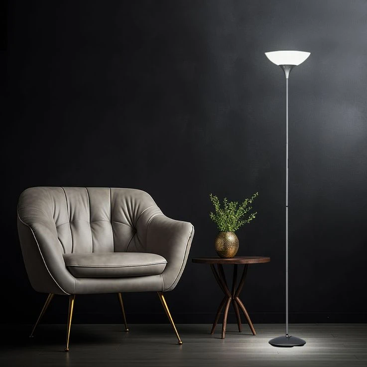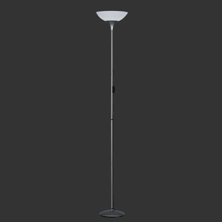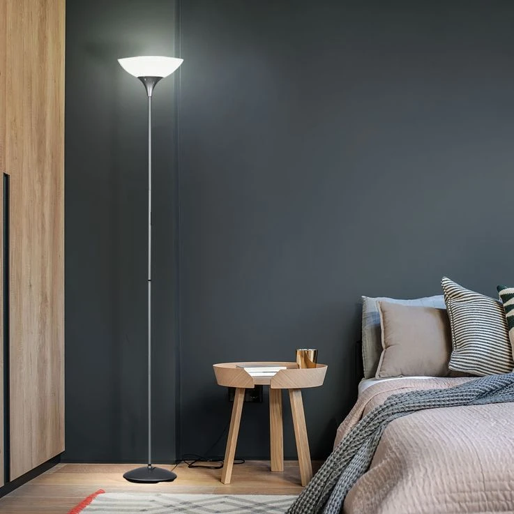 Design Deckenfluter aus titanfarbigem Metall.