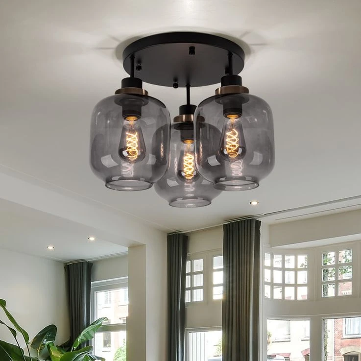 - MATERIAL/ FARBE: Die Deckenhalterung ist aus schwarz mattem Metall gefertigt. Die drei Lampenschirm bestehen aus Glas in rauchfarbener Optik und in abgerundeter Form.