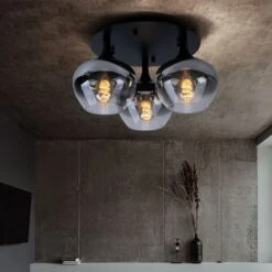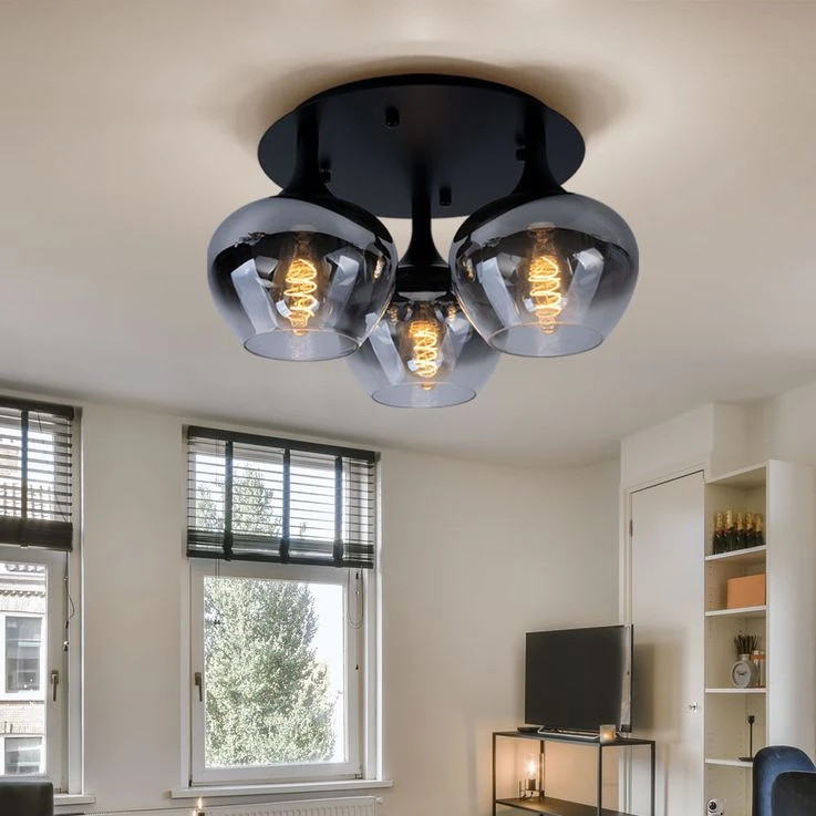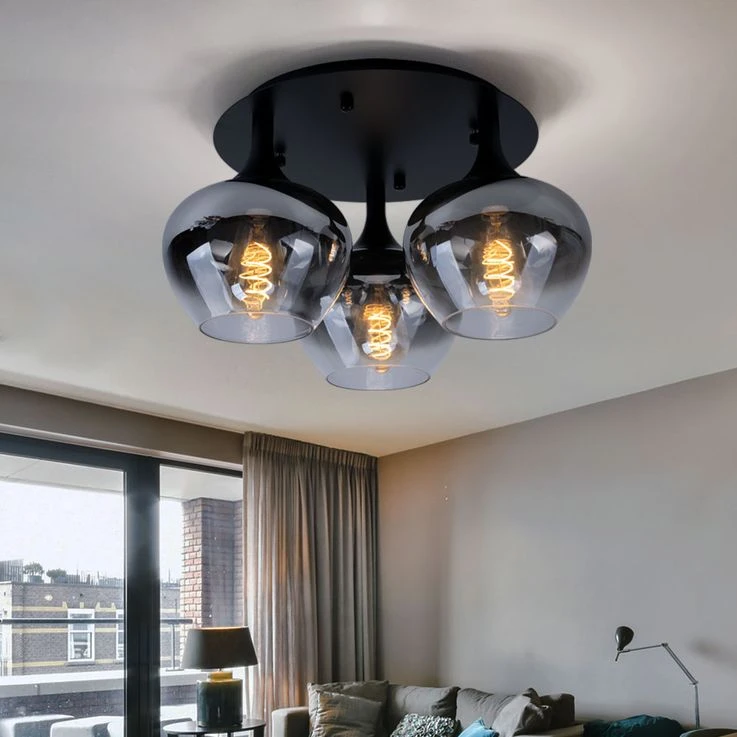 - MATERIAL: An einer runden Deckenbefestigung (Ø 30 cm) befinden sich drei E27 Fassung mit formschönen rauchfarbenen Glasschirmen (Ø 18 cm).