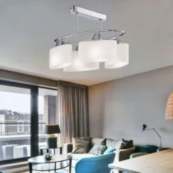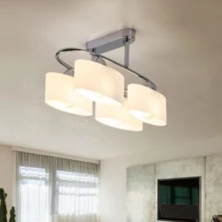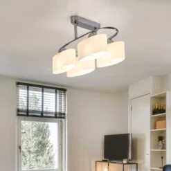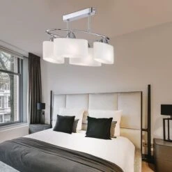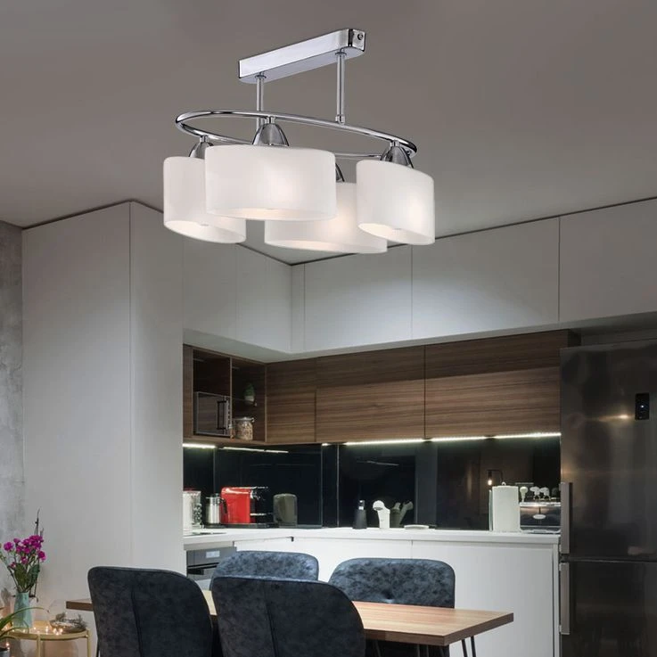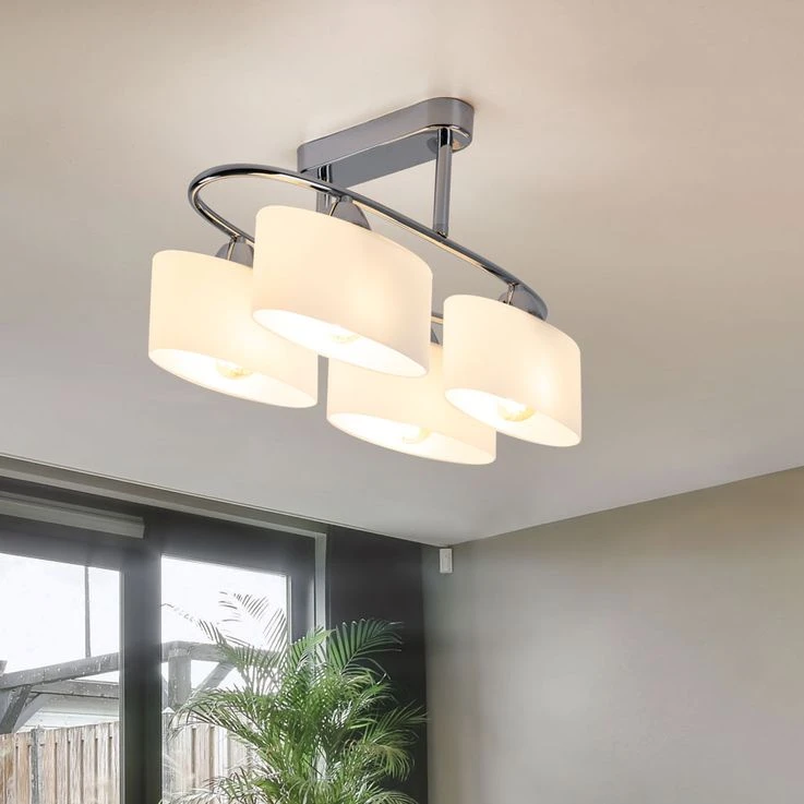 - MATERIAL: Die Innenleuchte besteht aus einer ovalen Aufhängung aus Chrom und wir von vier, ebenfalls ovalen, Lampenschrimen aus satiniertem Glas vervollständigt.