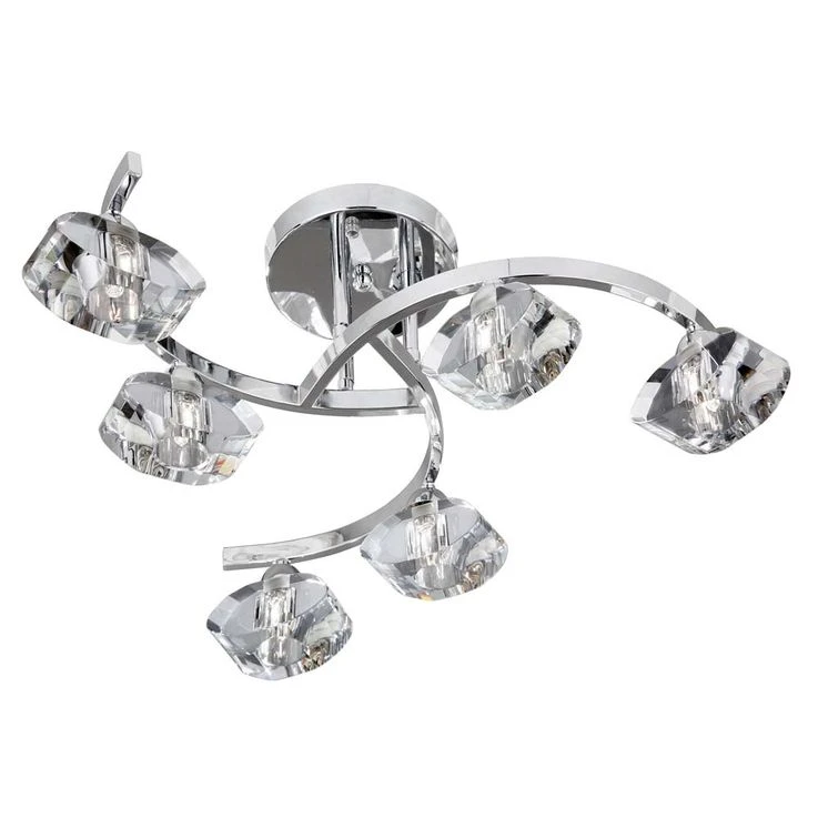 Diese 6-flammige Sculptured Ice Chromleuchte ist halbbündig mit klarem Glas und ist hochmodern und stilvoll. Die Armatur hat eine kreisförmige Deckenplatte aus Chrom und drei gebogene Arme, die zu den atemberaubenden ovalen Glasschirmen führen. Und es bietet eine praktische Lichtquelle für jedes moderne Schlafzimmer, Wohnzimmer, Esszimmer oder Küche.