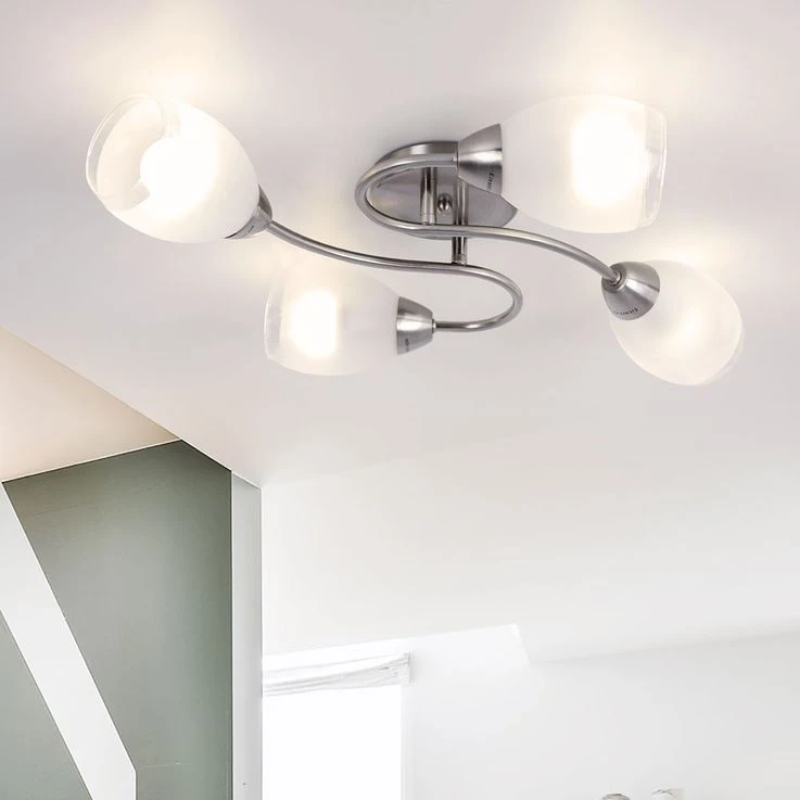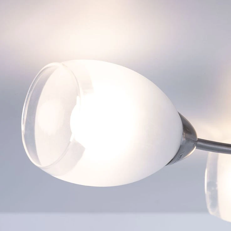 - MATERIAL/FARBE: Die chromfarbene aus Metall gefertigte Innenleuchte ist mit gläsernen satinierten Lampenschirmen versehen.
