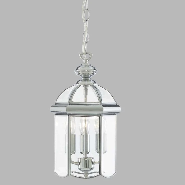 Diese 3flammige Chromlaterne mit abgeschrägtem gewölbtem Glasschirm ist leicht, hell und traditionell. Der Rahmen mit glänzenden Chromfinish verfügt über klare Glasscheiben an den Seiten sowie abgeschrägte Glasschirme an der Oberseite, die mit einer bauchigen Fassung und einer Kette an der Decke befestigt sind. Die attraktive Leuchte mit drei Kerzen lässt die Laterne funkeln und erhellt gleichzeitig den gesamten Raum.