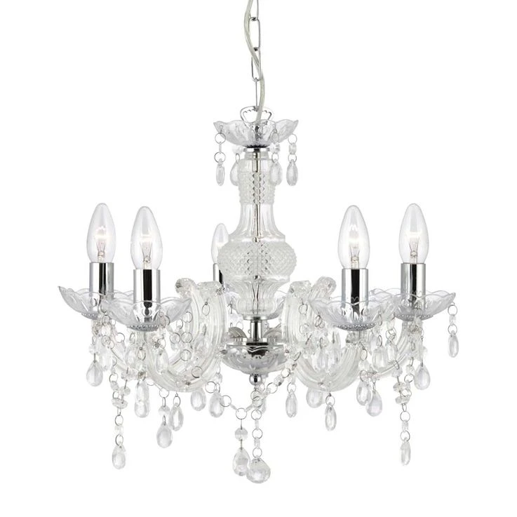 Der spektakuläre, stilvolle 5falmmige Kronleuchter Marie Therese mit klarem Glas und Chromrahmen hat einen aristokratischen Stil, der jedem großen Raum einen theatralischen Touch verleiht. Diese Deckenleuchte ist ein traditionelles Design mit einem modernen Touch. Sie ist luxuriös mit passenden Tropfen in Birnenform, gebogenen Armen und Acrylglasverzierungen verziert, die jedem Interieur einen glamourösen Akzent verleihen