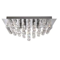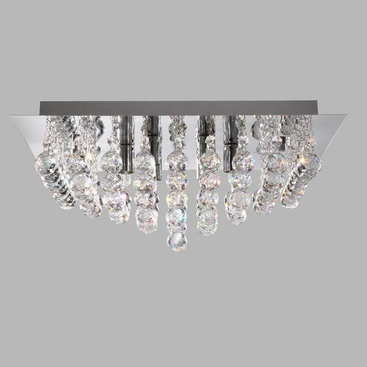 Diese 4flammige quadratische Hanna Chrom Deckenleuchte mit transparenten Kristallkugeln macht an jeder Decke eine gute Figur. Die luxuriöse Leuchte passt bündig zur Decke und verfügt über vier Lampen, die von dekadenten Kristallverzierungen und Kugeln umgeben sind. Die elegante quadratische, verspiegelte Rückplatte rundet den Look dieses modernen Kronleuchters ab.