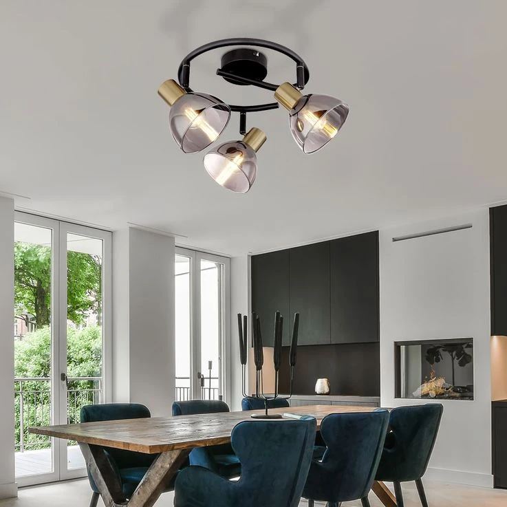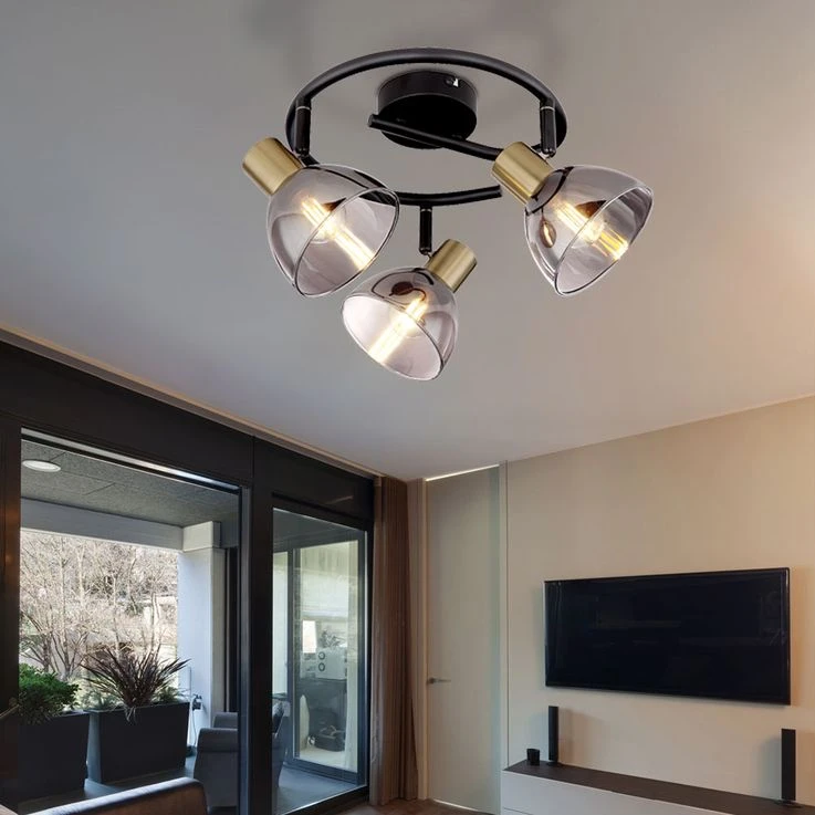 - DESIGN: Die Spotleuchte aus schwarzem und messing mattem Metall wird von drei Schirmen aus rauchfarbenen Glas vervollständigt.