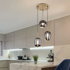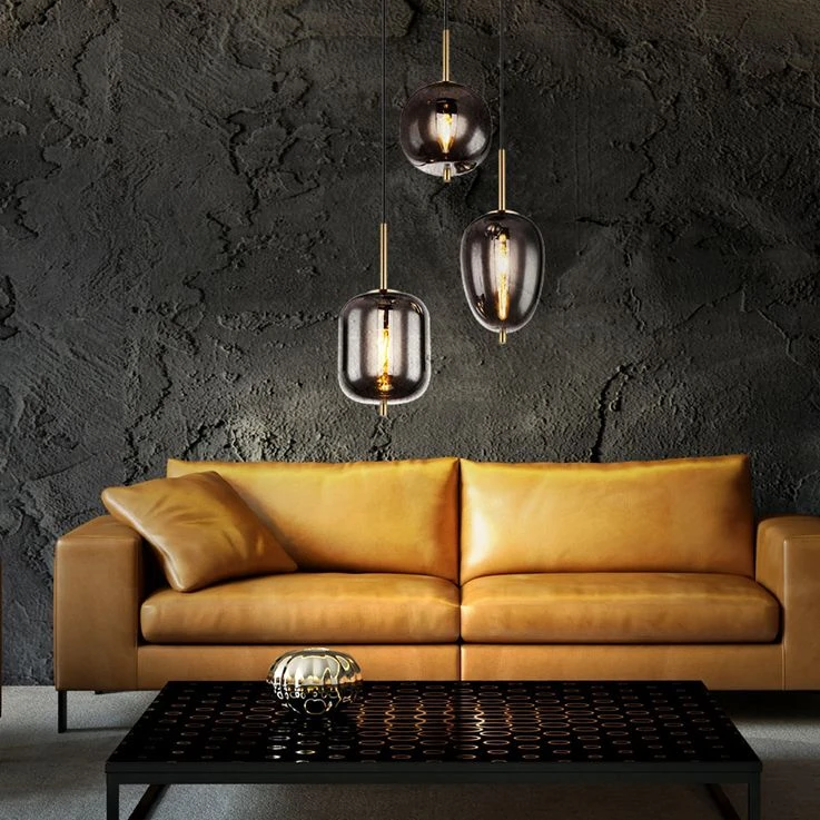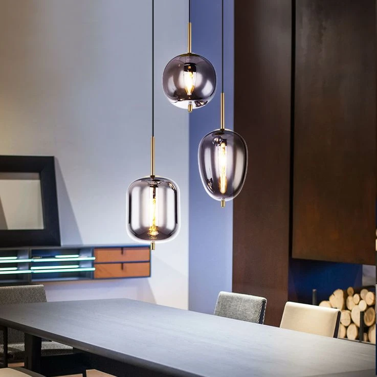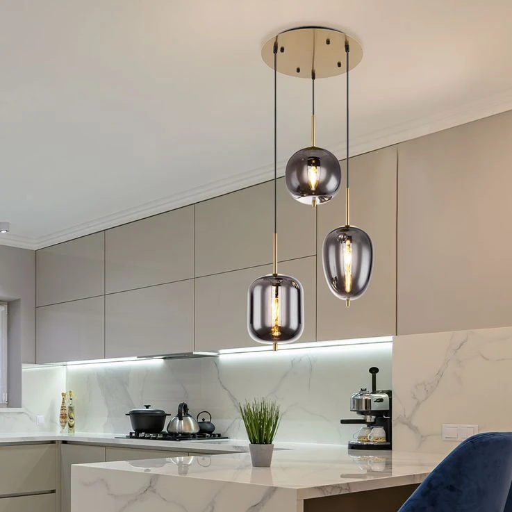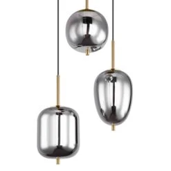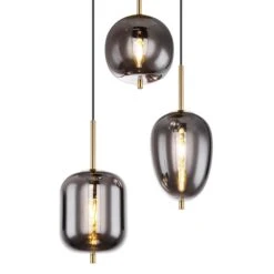 - MATERIAL/FARBE: Die aus Metall und Glas gefertigte Lampe verfügt über drei unterschiedlich geformte Lampenschirme, sowie eine messingfarbige Färbung.