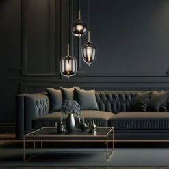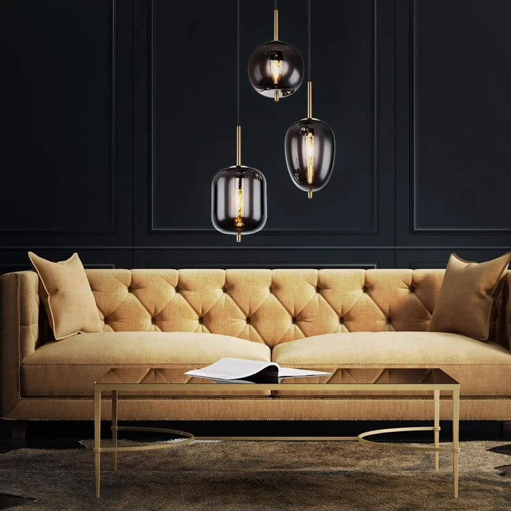 - DESIGN: Das Design dieser Leuchte ist von den drei verschieden geformten Lampenschirmen geprägt. Die Messingfärbung rundet ihre Optik ideal ab.
