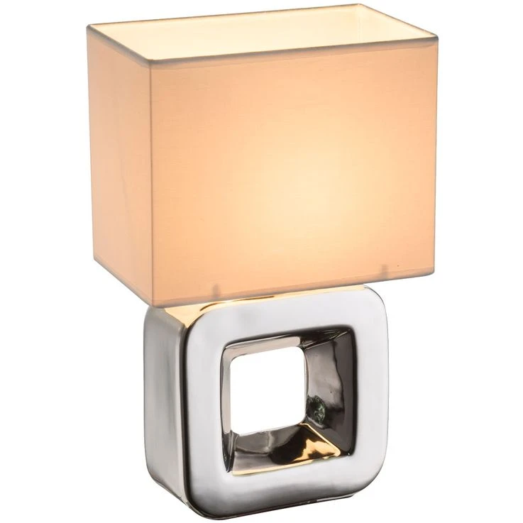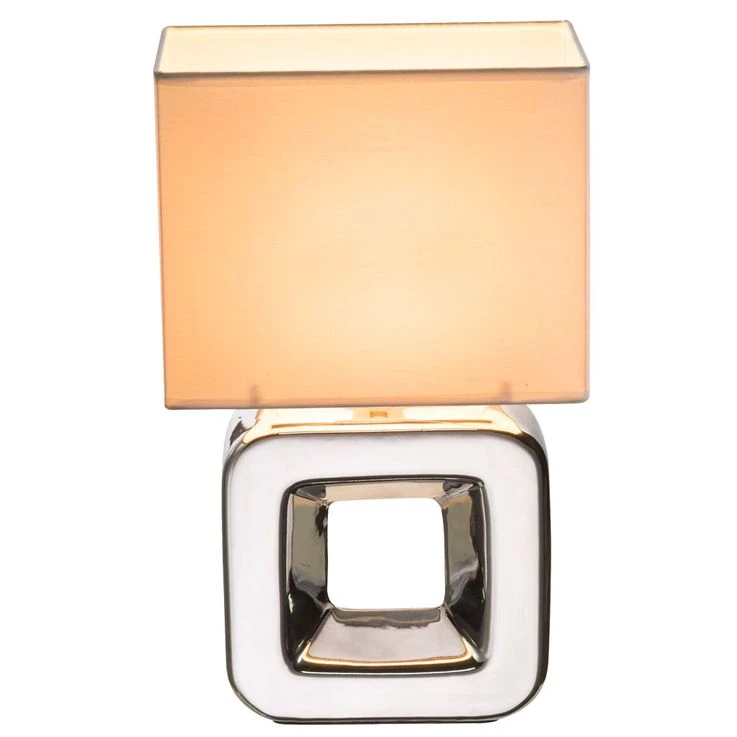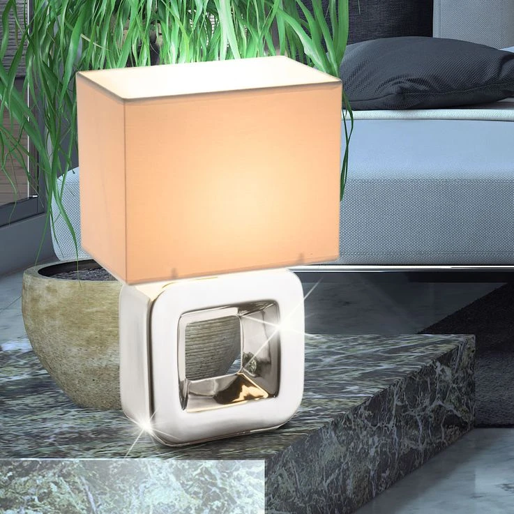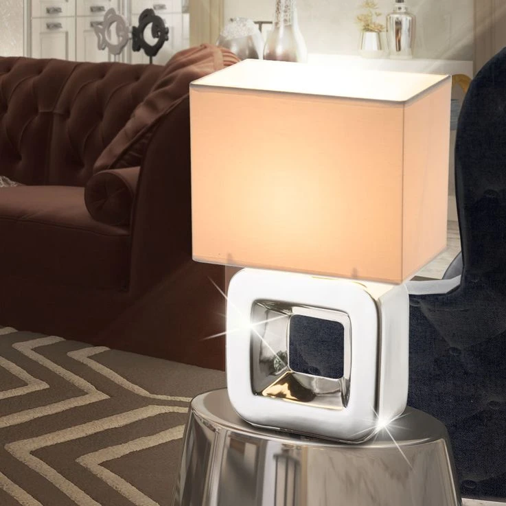 Diese Lampe aus verchromtem Keramik und einem weißem Lampenschirm Textil passt aufgrund des modernen Designs in nahezu jeden Wohnbereich.