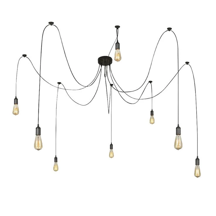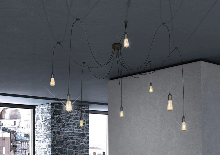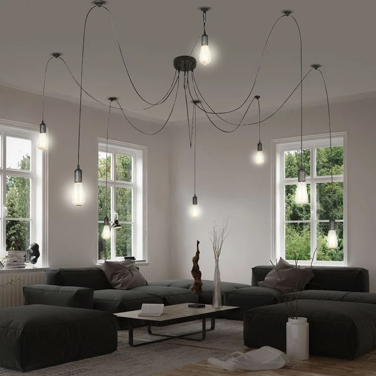 Durch die unterschiedlich langen Kabel der einzelnen Lampen können diese an der Decke beliebig befestigt und zusätzlich in der Höhe verstellt werden.