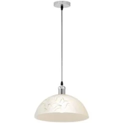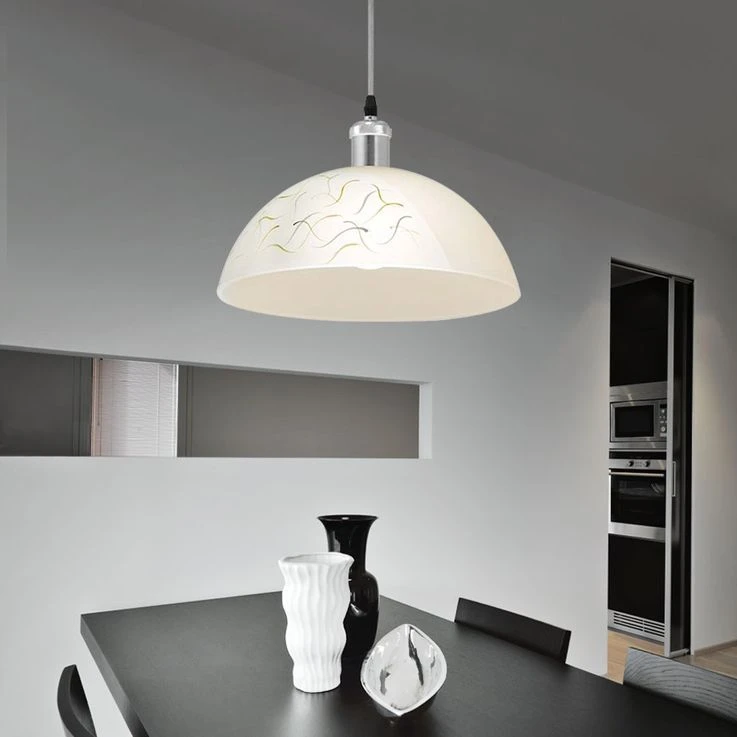 Der zum Teil mit bunten Motiven versehene runde Lampenschirm (Ø35cm) aus Glas hängt am passenden grauen Textilkabel mit nickelmatten Metallteilen. Die verfügbare E27 Fassung ermöglicht Ihnen das passende Leuchtmittel und damit Lichtfarbe und Lichtstärke selber zu bestimmen (max. 60W). Aufgrund ihrer Stromersparnis und Langlebigkeit empfehlen wir LED-Lampen.