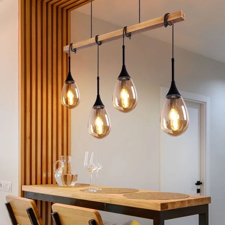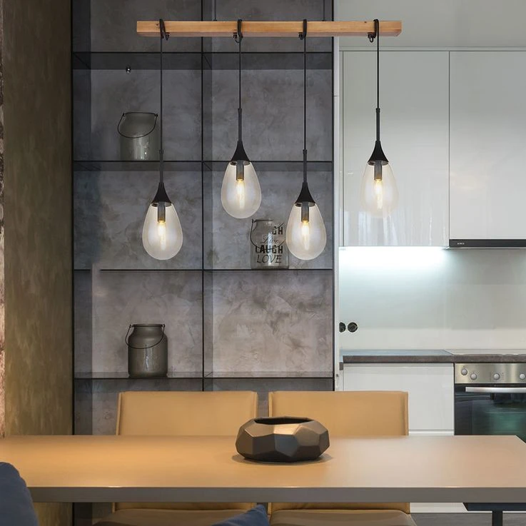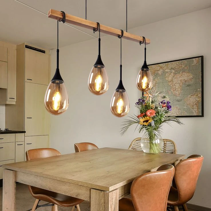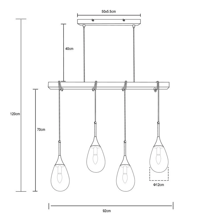 - MATERIAL: Die Hängeleuchte besteht aus 4 Glasschirmen, welche jeweils mit einer E14 Fassung ausgestattet sind und an schwarzen Kabeln 1,2m von der Decke hängen.
