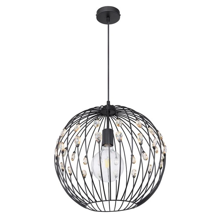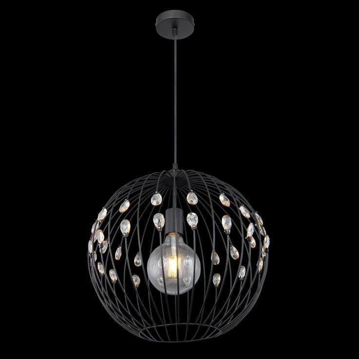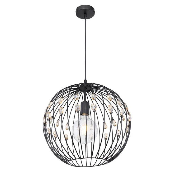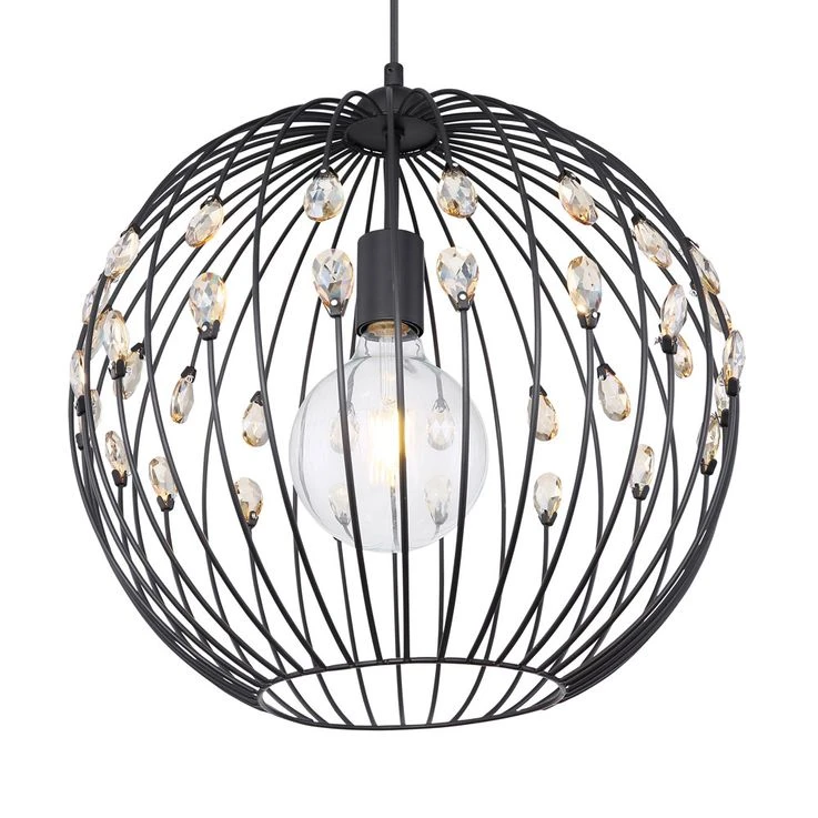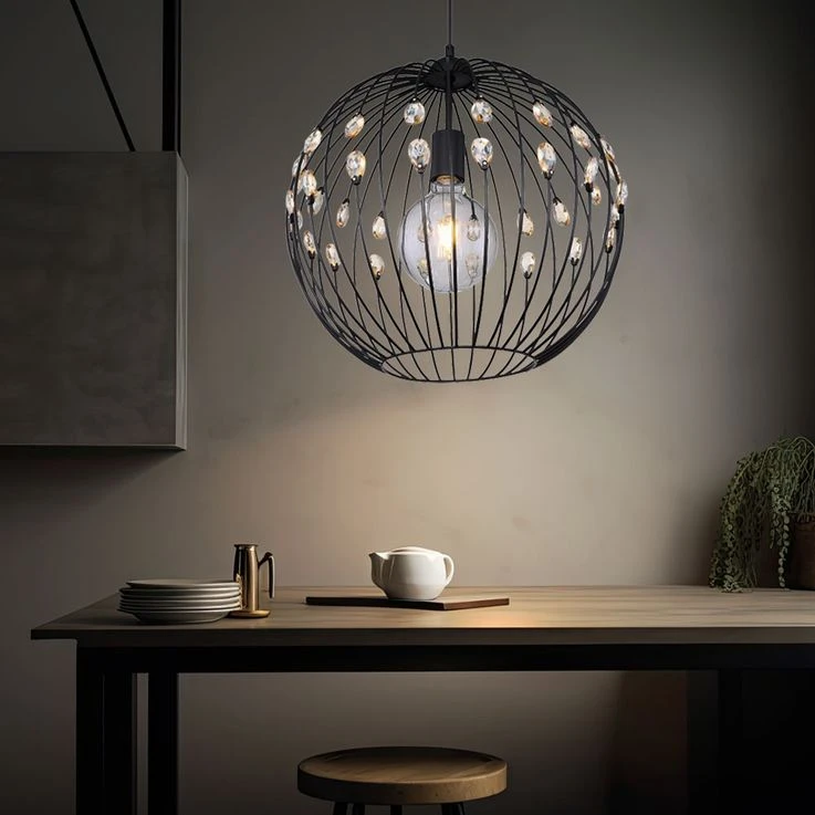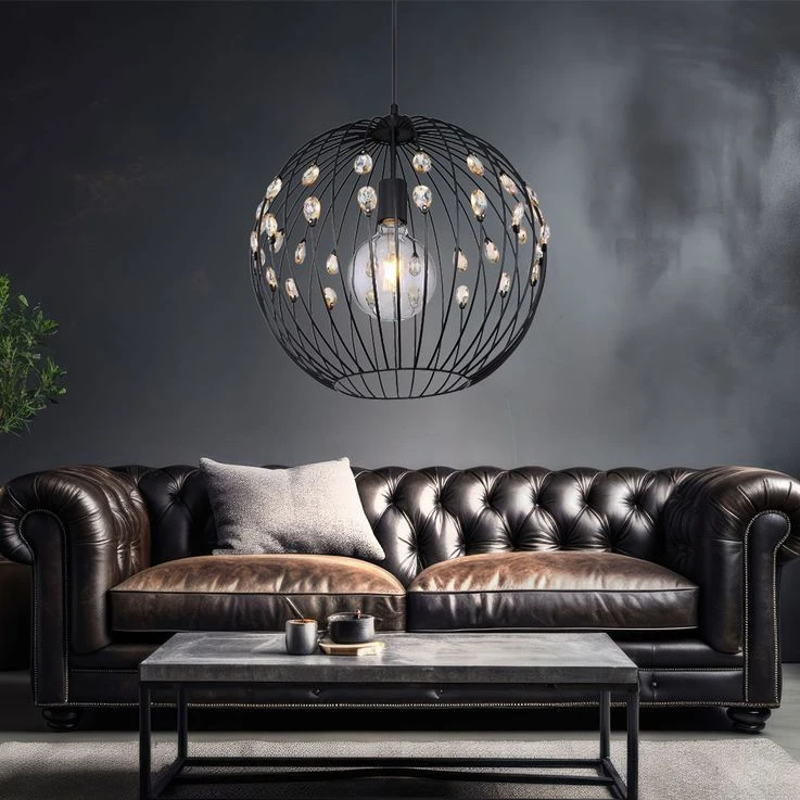 Diese schwarz matte Hängelampe überzeugt durch ihr Retrodesign und besticht zugleich mit den im Lampenschirm (Ø40cm)eingesetzten K9 Kristallen. Des weiteren erzeugt der gitterförmigen Lampenschirme aus schwarzem Metall eine interessante Schattenotpik auf ihre Wände. Diese Leuchte hat eine Gesamtlänge von 120 cm und garantiert ihnen einen Blickfang in ihrem Ess-/ und Wohnbereich. Durch die freie Wahl des Leuchtmittels (E27/max. 1 x 60W) können Sie selbst über Lichtstärke und Lichtfarbe dieser Innenleuchte bestimmen. Aufgrund ihrer Langlebigkeit empfehlen wir Ihnen LED Leuchtmittel zu verwenden. Durch andere Modelle dieser Serie können Sie das Bild Ihres Wohnraumes weiter verschönern.