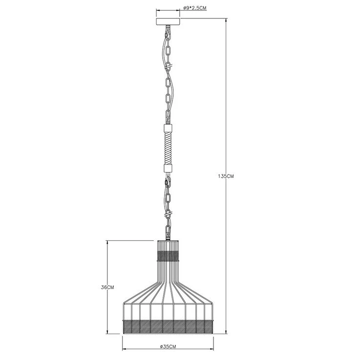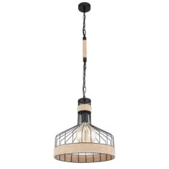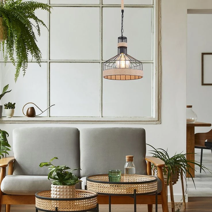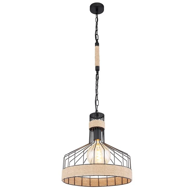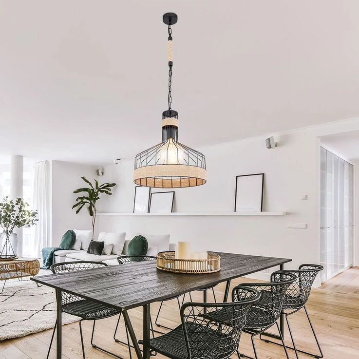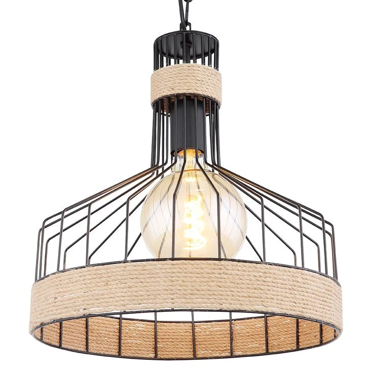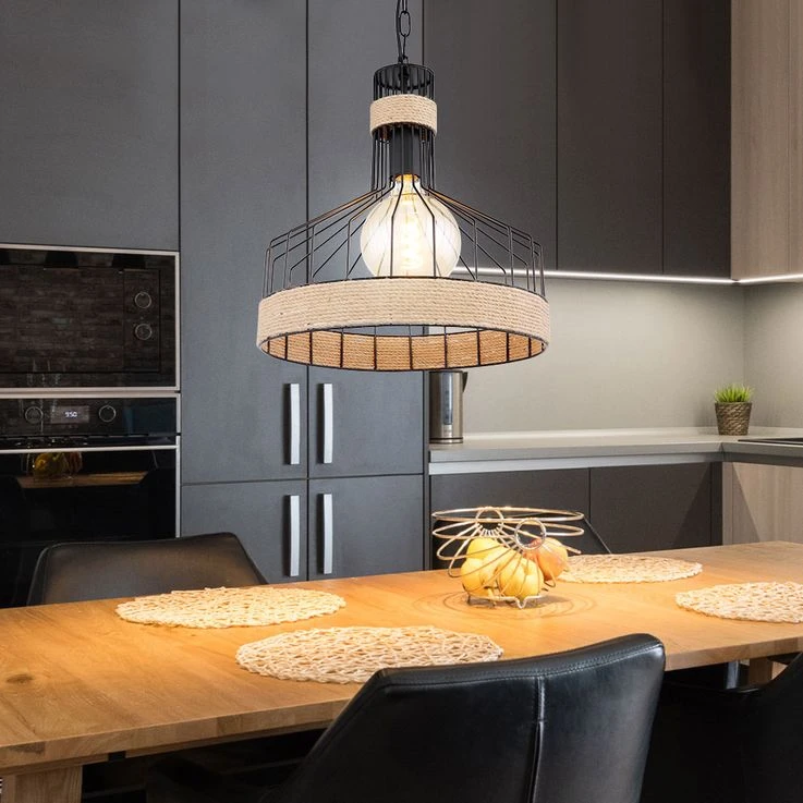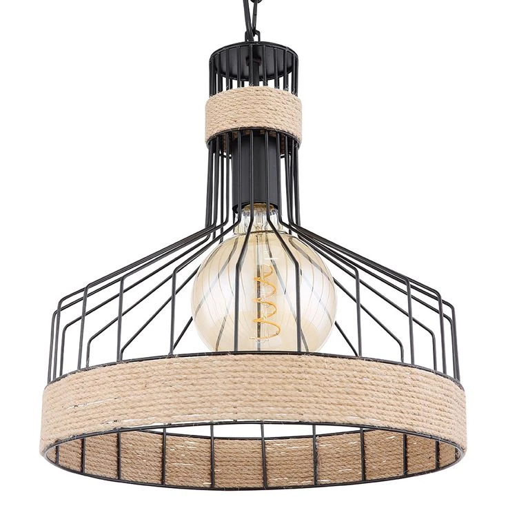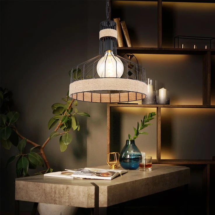 - DESIGN: Das Design dieser Hängelampe ist von einer Käfigoptik geprägt. Die schwarz gefärbten Metallstäbe und das braune Hanfseil komplettieren das Erscheinungsbild einwandfrei.