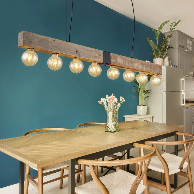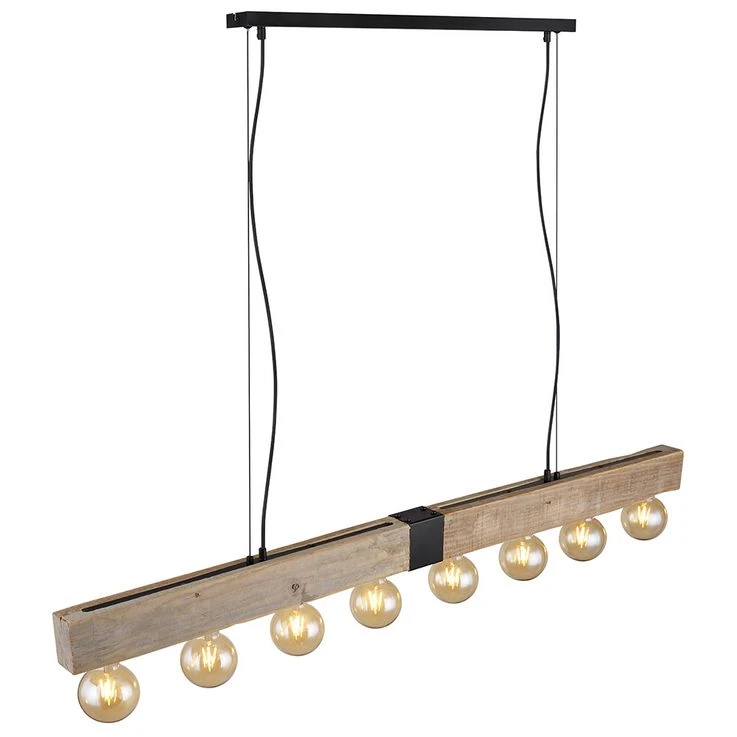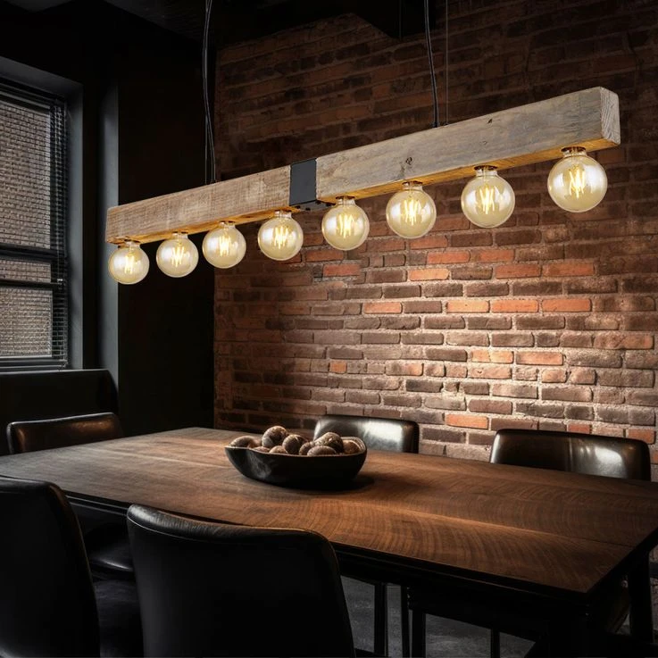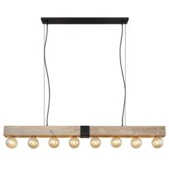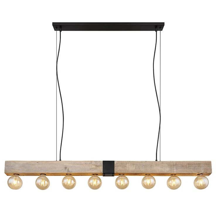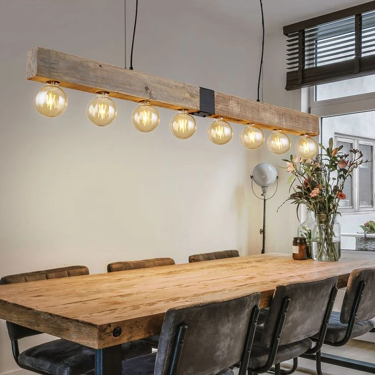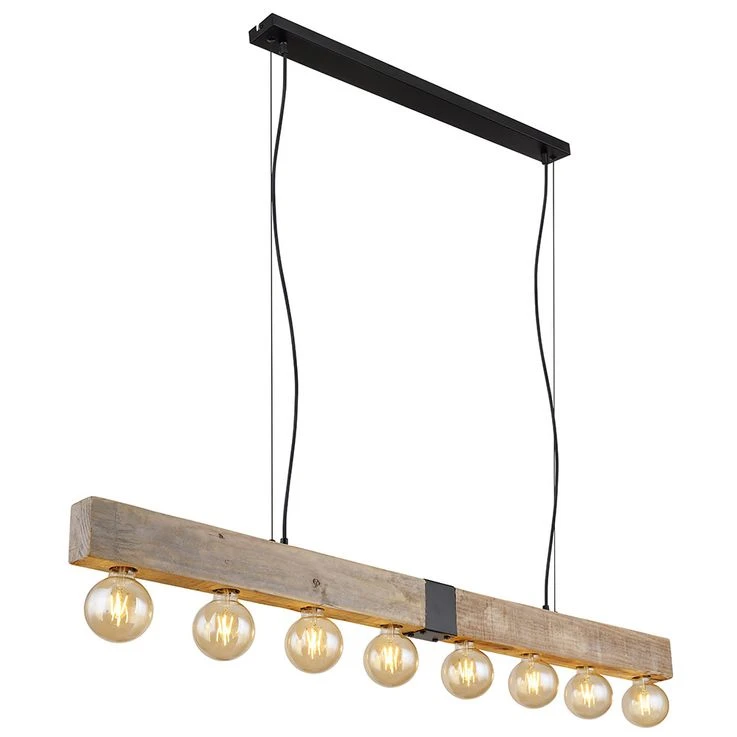 - MATERIAL/FARBE: An einer aus Metall gefertigten Deckenbefestigung befinden sich zwei 1,4 m lange Kabel an welcher sich ein Holzbalken mit acht E27 Fassungen befinden.