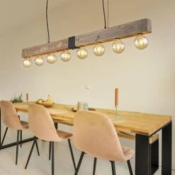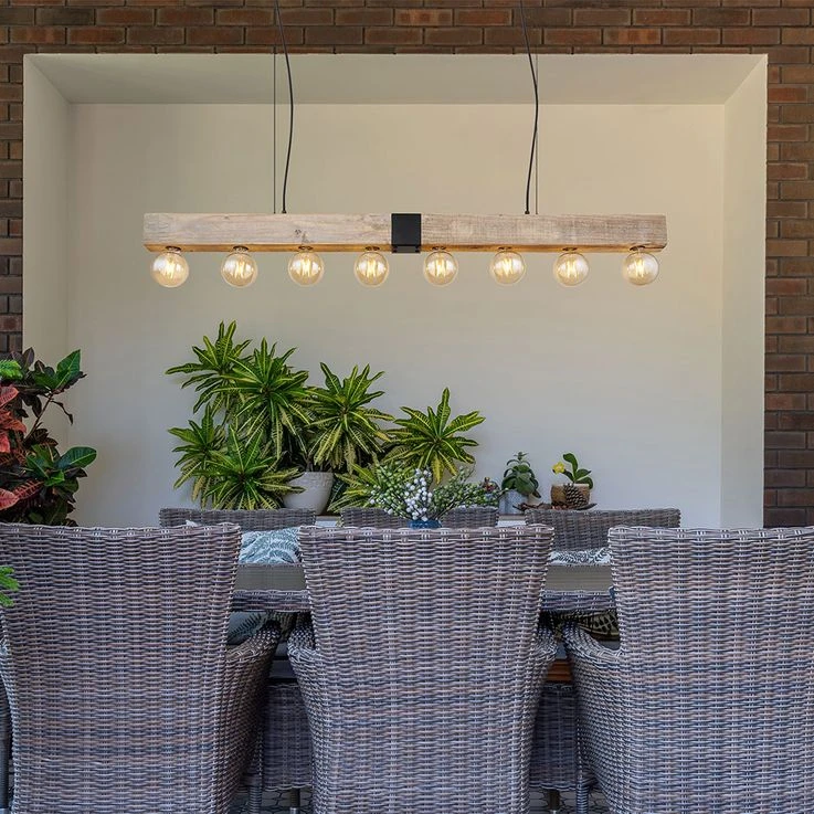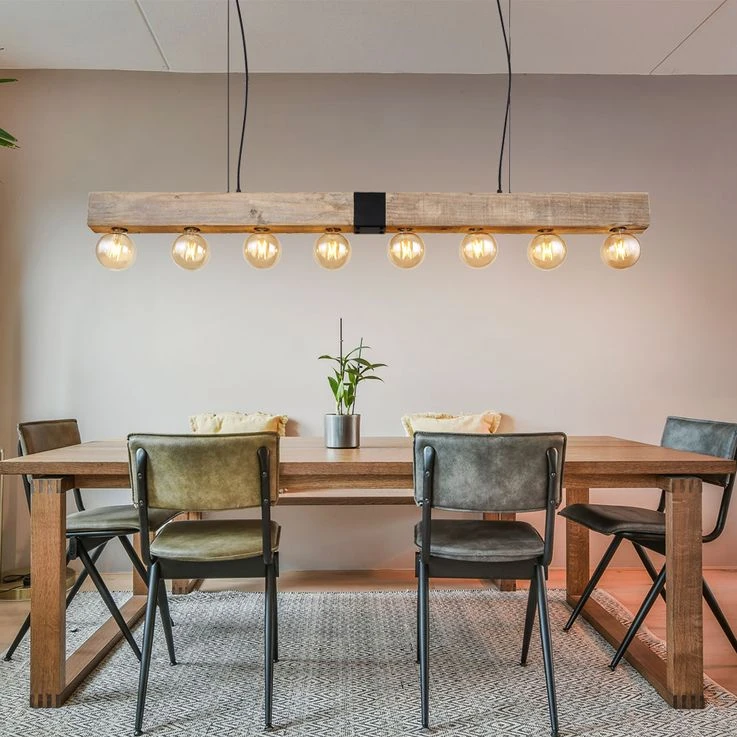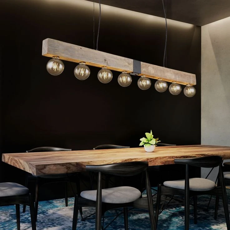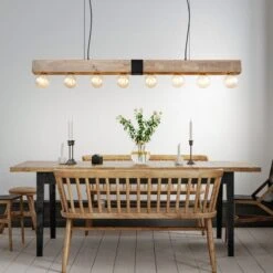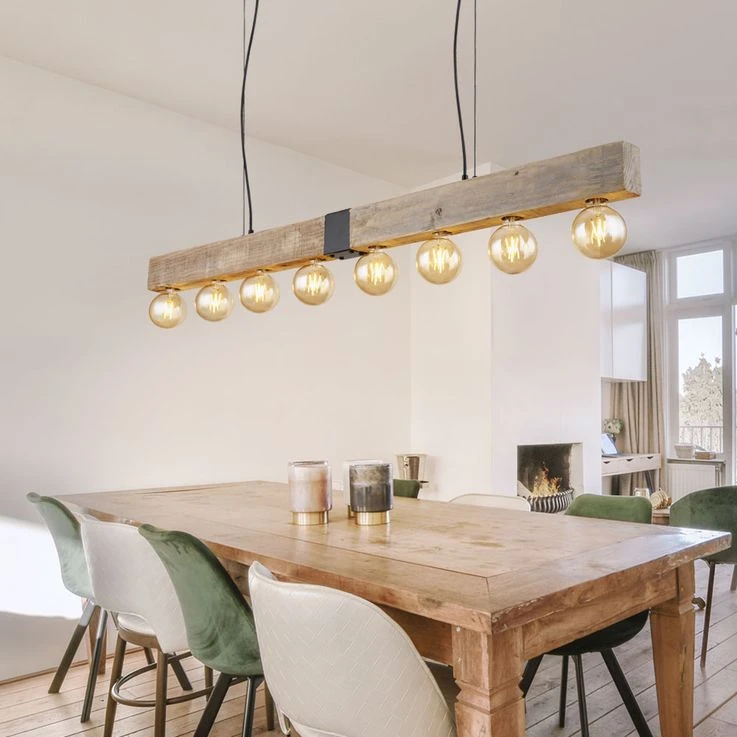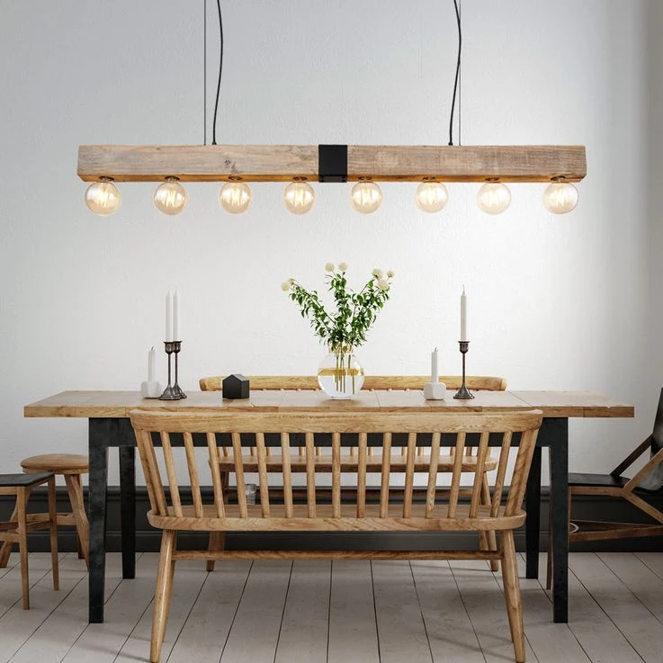 - MATERIAL/FARBE: An einer aus Metall gefertigten Deckenbefestigung befinden sich zwei 1,4 m lange Kabel an welcher sich ein Holzbalken mit acht E27 Fassungen befinden.