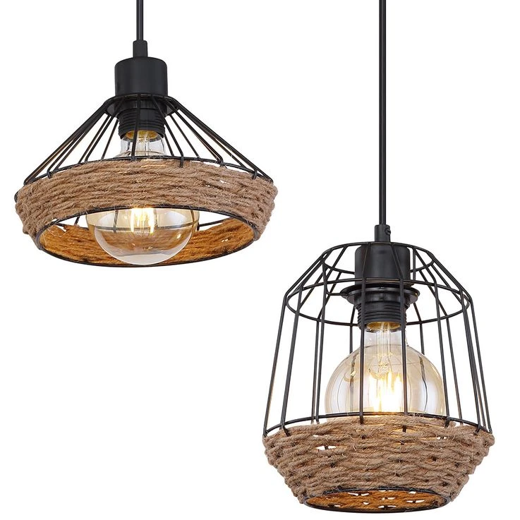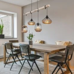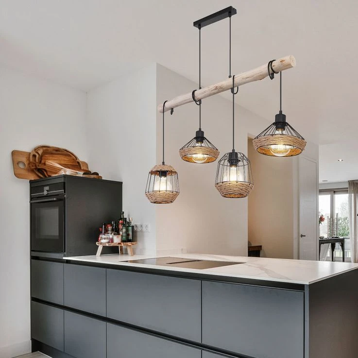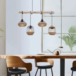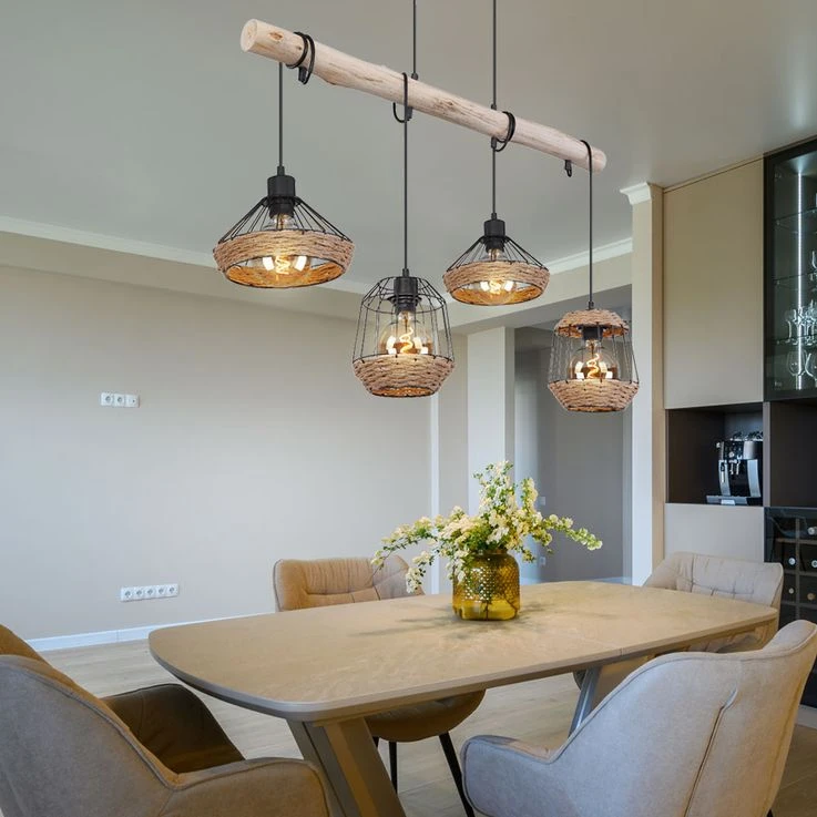 Die 105 cm lange Hängeleuchte besteht aus einem Holzstab, der mit vier schwarzen Kabeln umwickelt, von der Decke hängt. Die Kabel sind mit vier schwarzen Metallgitterschirmen versehen, welche Sie mit E27-Leuchtmitteln Ihrer Wahl bestücken können. Dadurch haben Sie die Möglichkeit, Lichtfarbe und Helligkeit individuell zu bestimmen.