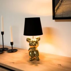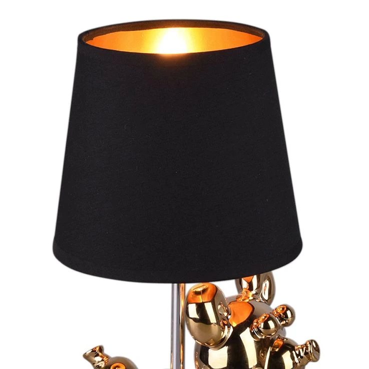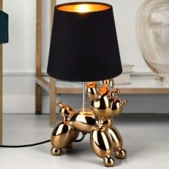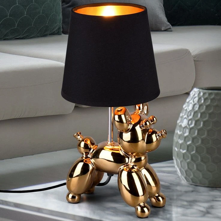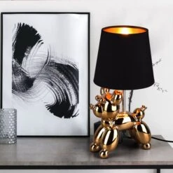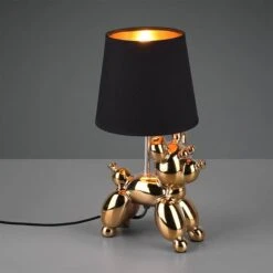 Diese Tischleuchte ist durch ihr ungewöhnliches Design ein echter Blickfang. Der goldfarbene Keramikfuß der Lampe hat die Form eines Hundes und wird durch einen schwarzen Textilschirm vervollständigt.
