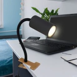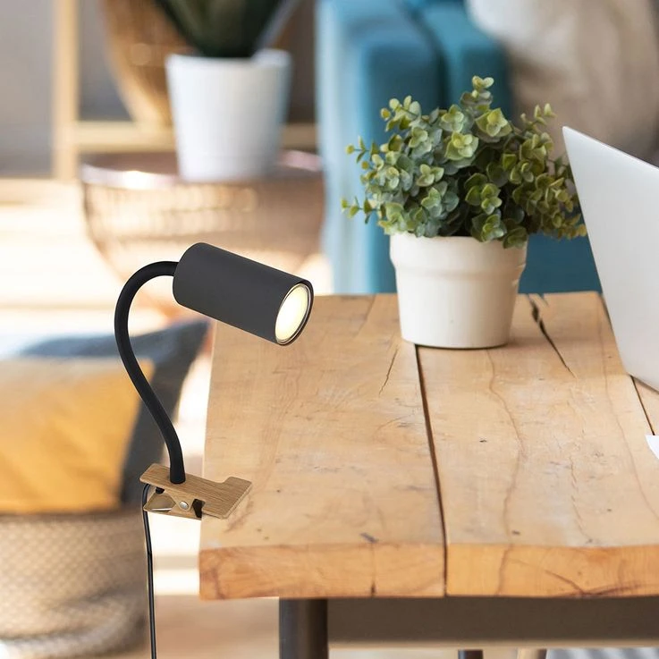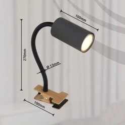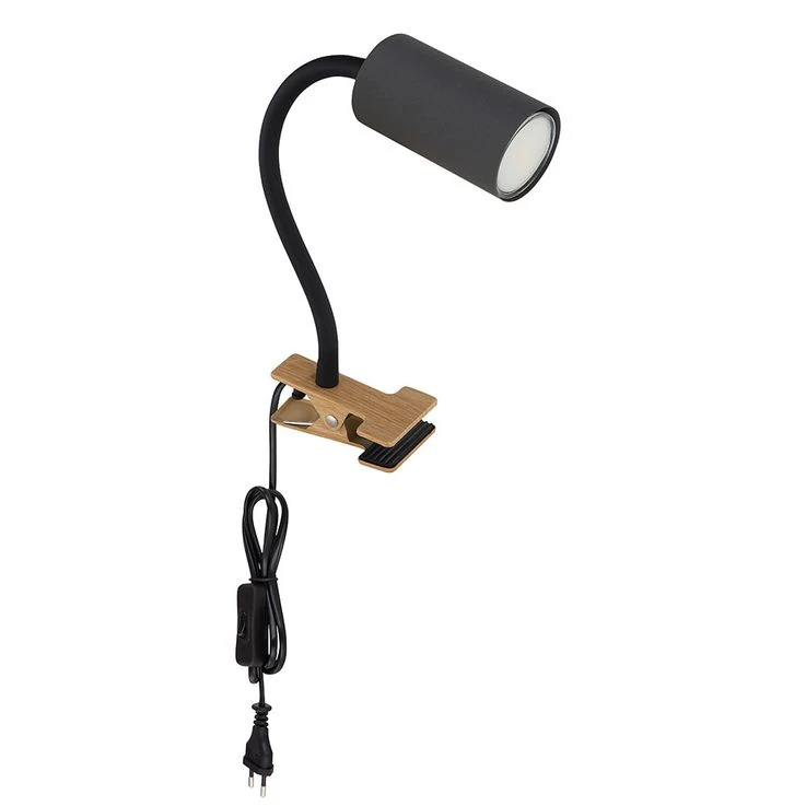 Der kleine klassische Klemmstrahler ist hergestellt aus schwarzem Kunststoff mit Holzverzierungen und mattem Metall in Graphit.
