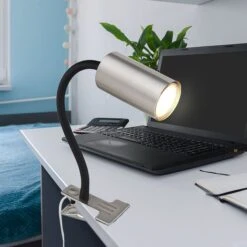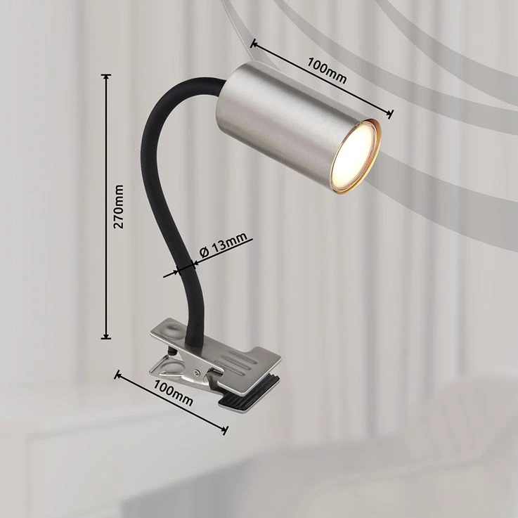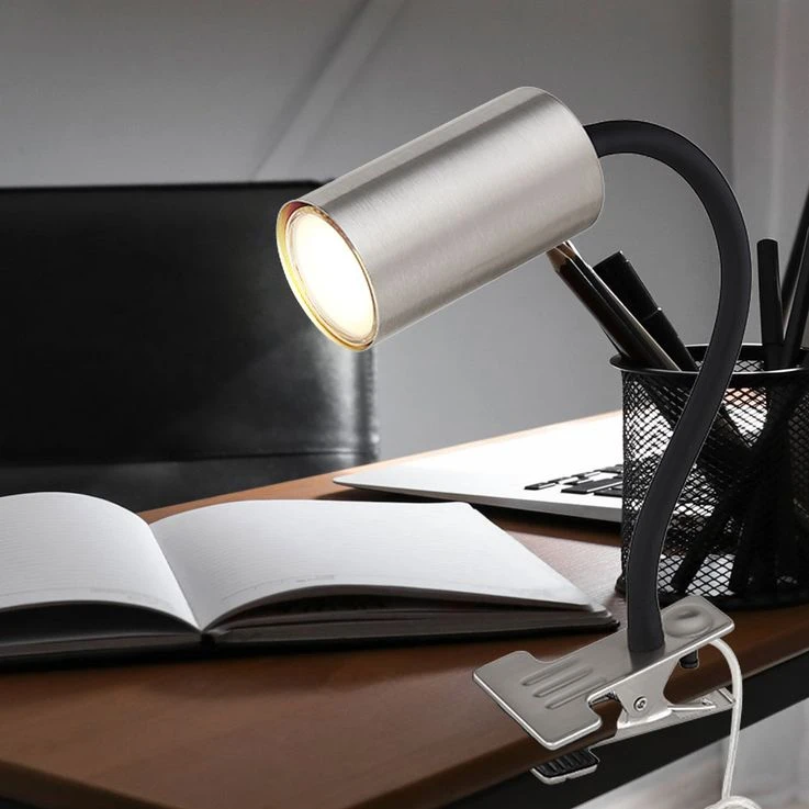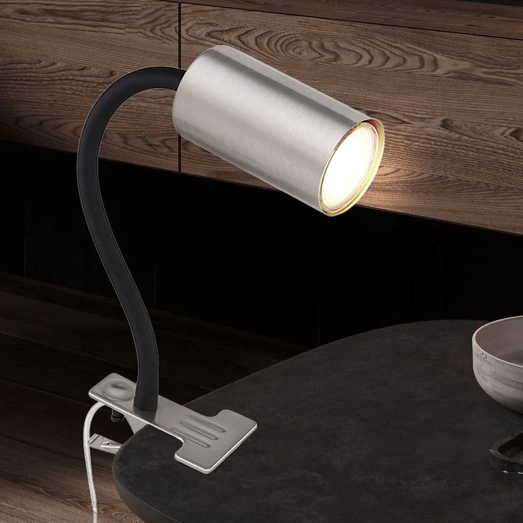 Der kleine klassische Klemmstrahler ist hergestellt aus schwarzem Kunststoff und Nickel mattem Metall.