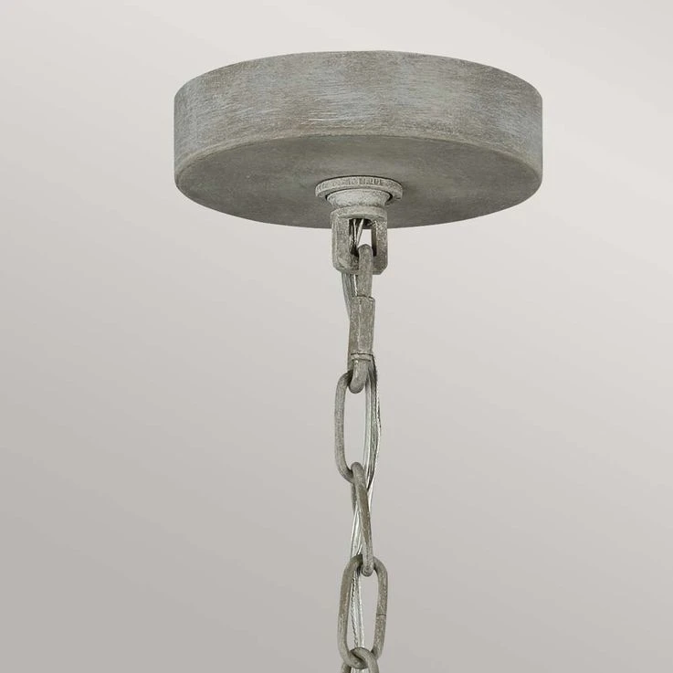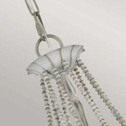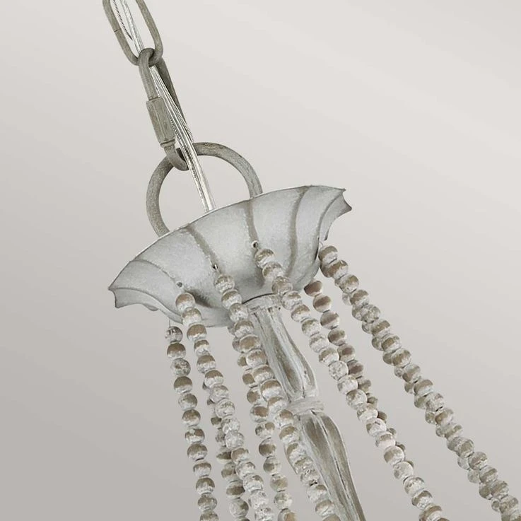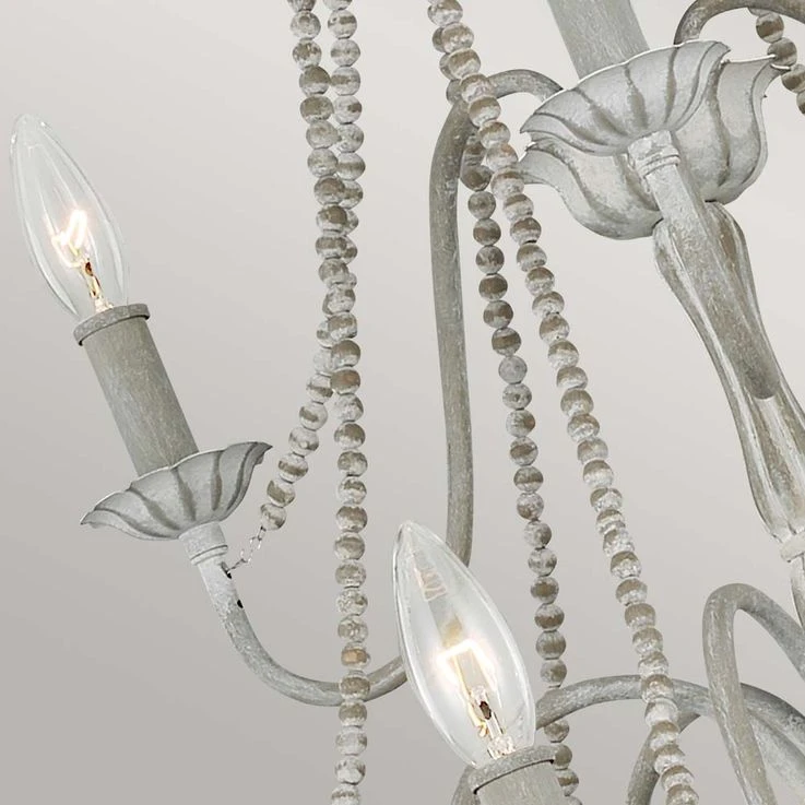 Der 9LT Maryville Chandelier verfügt über weiche weibliche Merkmale in einem französischen Landstil. Die von Blumen inspirierten Bobeches und zarten Holzperlensträhnen sind alle in einem verwitterten Wäschegrau fertig.