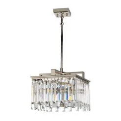 Widder hat eine kühne quadratische Armarchitektur, die in poliertem Nickel gefertigt ist und mit hochwertigen geschliffenen Glaskristallen ergänzt wird. Ein weicherer Opalglasboden kontrastiert mit lose hängenden abwechselnden seitlichen Kristallen, die einen verspielten Lichteffekt bieten.