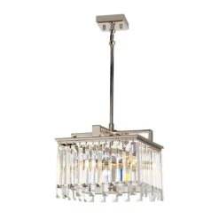 Widder hat eine kühne quadratische Armarchitektur, die in poliertem Nickel gefertigt ist und mit hochwertigen geschliffenen Glaskristallen ergänzt wird. Ein weicherer Opalglasboden kontrastiert mit lose hängenden abwechselnden seitlichen Kristallen, die einen verspielten Lichteffekt bieten.