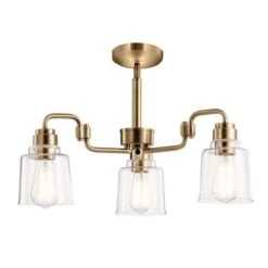 Der Aivian 3 LT-Kronleuchter verfügt über einen industriellen Gebäude in einem verwitterten Messing-Finish. Es ist sowohl raffiniert als auch nervös und wird mit sich verjüngten Kantenglasfarben ergänzt. Cabrio in Semi-Flush.