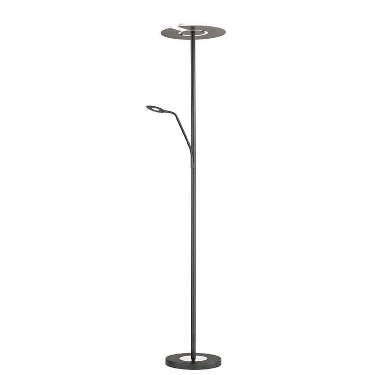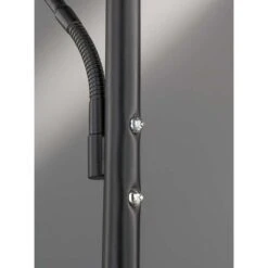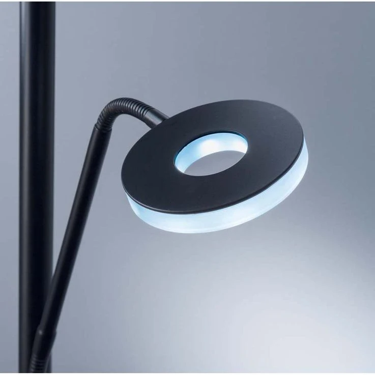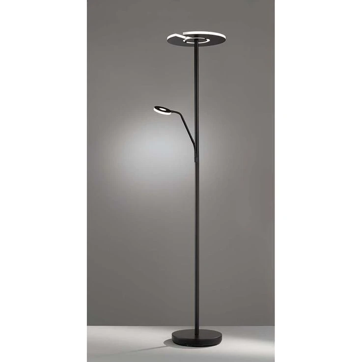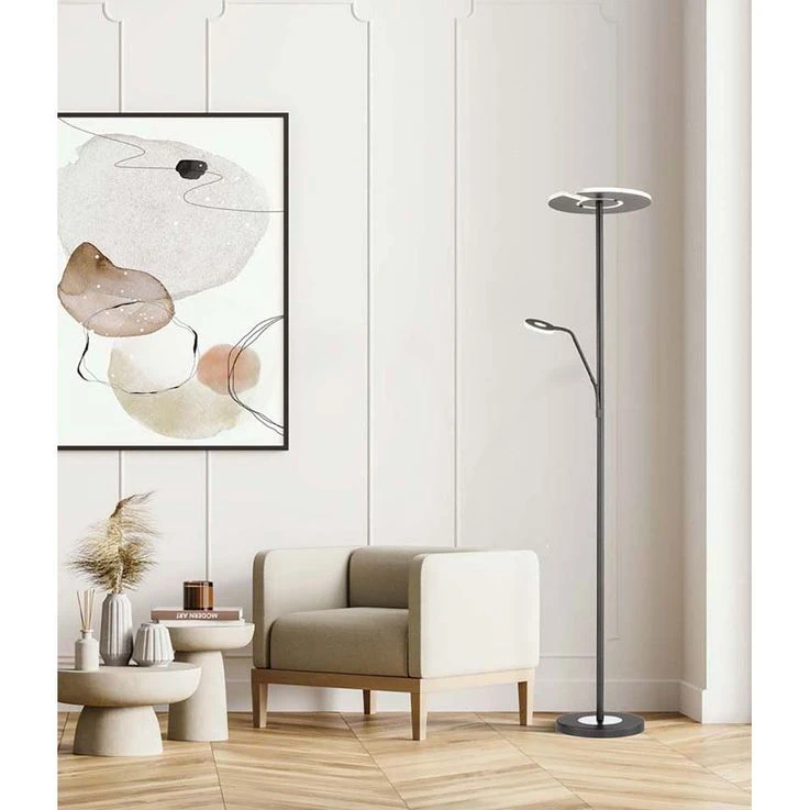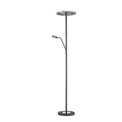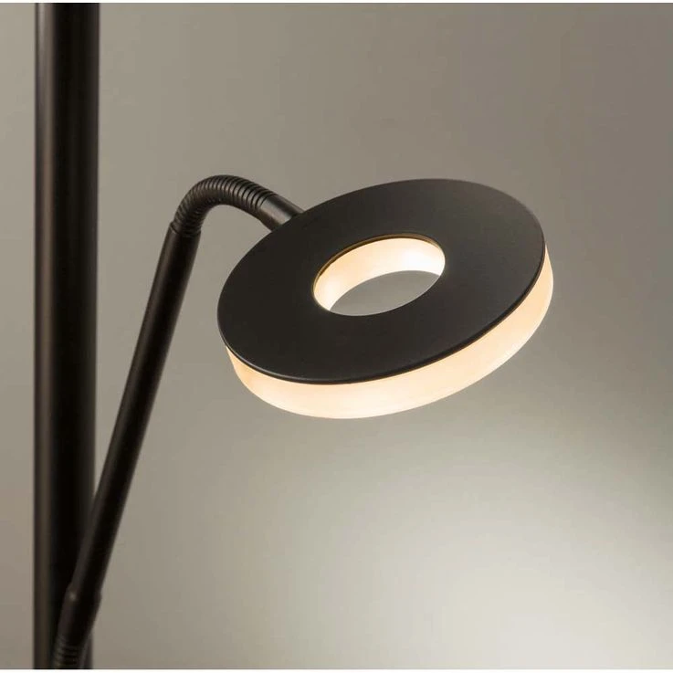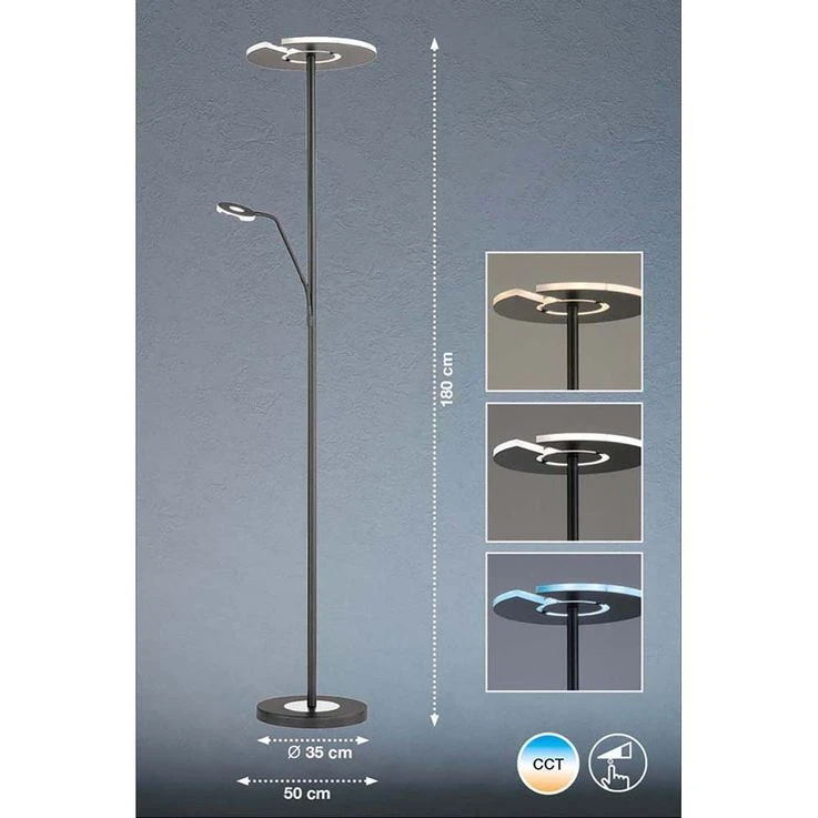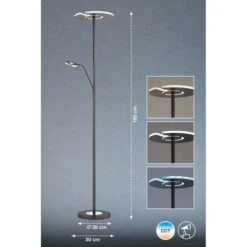 Haben Sie in Gedanken schon einen perfekten Platz für diese Stehleuchte gefunden? Auf den ersten Blick ist es eine klassische und schlichte Leuchte, doch auf den zweiten Blick verbergen sich in ihr zahlreiche Features. Lassen Sie und diese doch im Folgenden gemeinsam entdecken. Licht dort, wo Sie es brauchen Die Stehleuchte ist gleich mit zwei Leuchtmitteln ausgestattet, die dort Licht spenden, wo es gebracht wird. Der Deckenfluter erzeugt ein helles Flutlicht. Der äußere Ring befindet sich an einem flexiblen Gelenk und kann daher in verschiedene Richtungen bewegt werden. Sie können das Deckenlicht nach oben richten, aber auch in die Ecken des Raumes. Zusätzlich besitzt die Stehlampe einen Lesearm. Stellen Sie die Leuchte am besten so auf, dass das Leselicht sich direkt über dem Lieblingssessel befindet und Sie zum Blättern in der Zeitung oder für andere Aktivitäten ausreichend Licht bekomme. Stehleuchte mit dimmbaren LED Die beiden Leuchtmittel im Fluter und in der Leselampe können separat voneinander an- und ausgeschaltet werden. Zudem sind sie in drei Stufen dimmbar. Über einen Tastdimmer können die Lampen sogar stufenlos gedimmt werden, damit Sie es sich zu jeder Tages- und Nachtzeit so richtig gemütlich machen können in Ihren Räumen. Zeitloses Design aus Metall in dezenten Farben Der Fuß der Leuchte und auch das Gestell sind aus Metall gefertigt. Die Farbkombination aus Chromfarben und Schwarz bildet einen schönen Kontrast und schafft ein zeitloses Design dieser Leuchte, an dem Sie nicht nur heute, sondern auch morgen noch Freude haben. Darüber hinaus verzichtet die Leuchte auf alle überflüssigen Schnörkel und Detail. Wir freuen uns auf Ihre Bestellung und wünschen Ihnen viel Freude mit unserer Stehleuchte Dent.