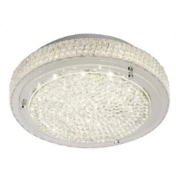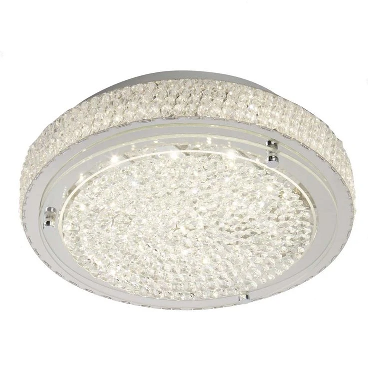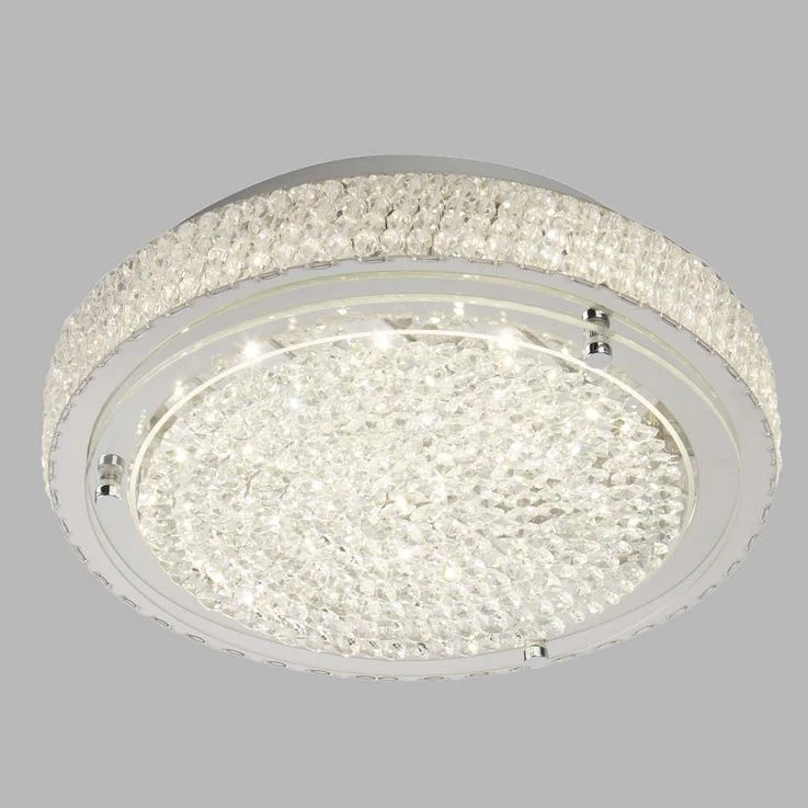 Diese Vesta deckenbündige LED-Leuchte mit Chromrand und Kristallinnendekoration ist intrikat und elegant. Der polierte Chrom-Finish-Ring an der Außenseite des Schirms umgibt die Kristallgefüllte Mitte der Leuchte. Die Deckenleuchte wird durch die neueste energiesparende LED-Technologie beleuchtet, und das Licht wird von den klaren Kristallkugeln reflektiert, damit das gesamte Teil beim Einschalten wunderschön funkelt.