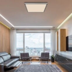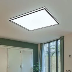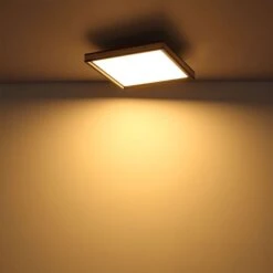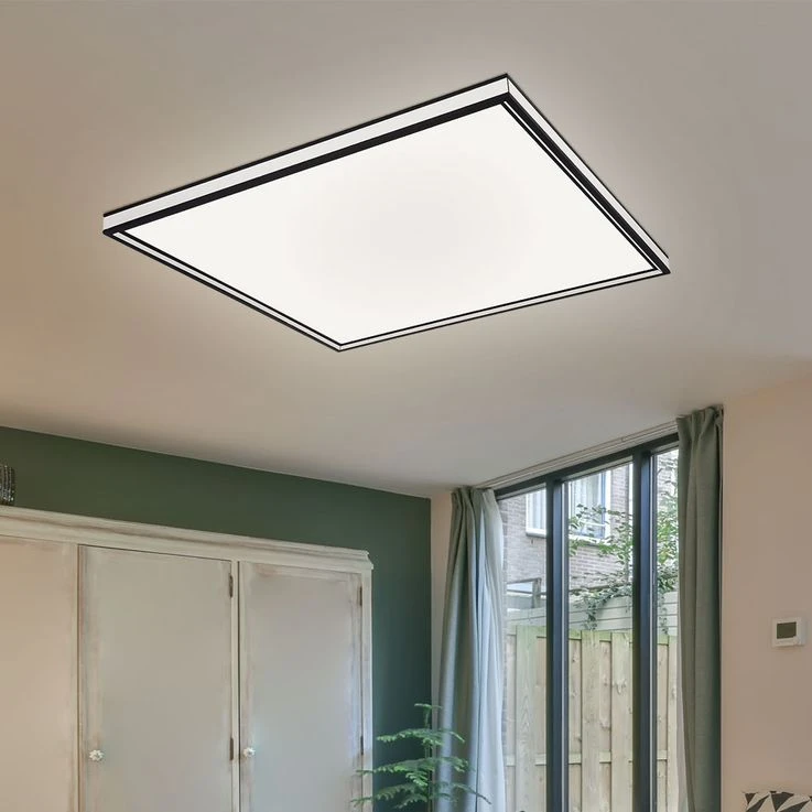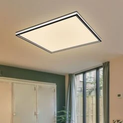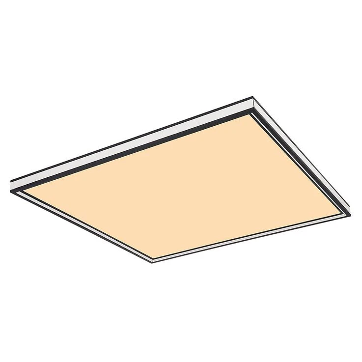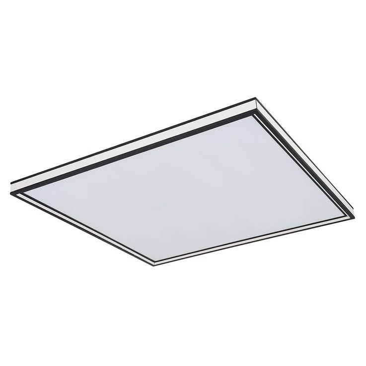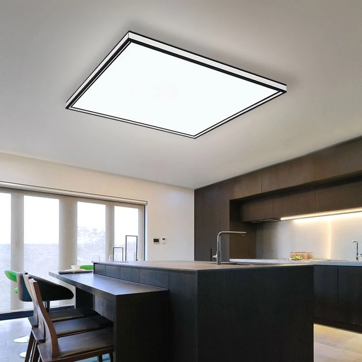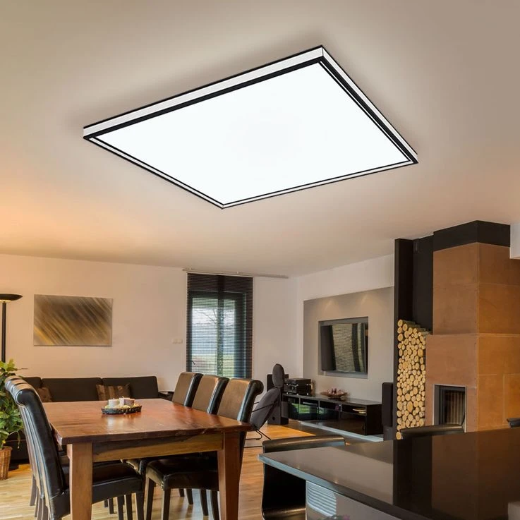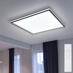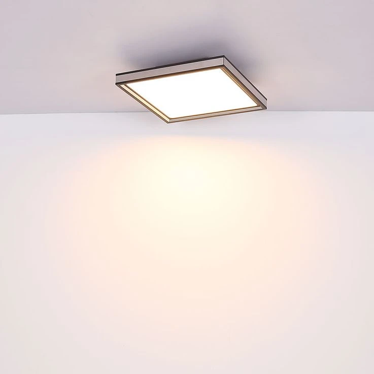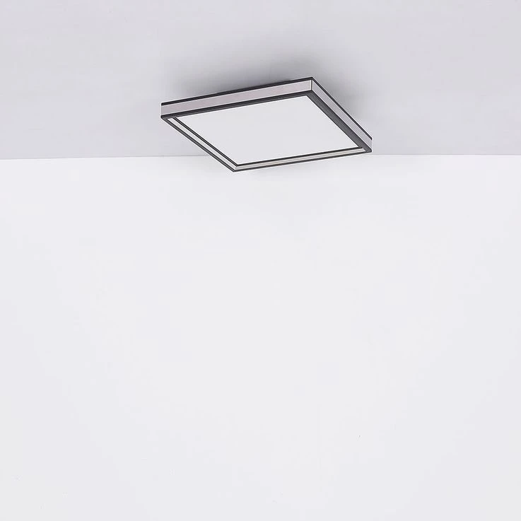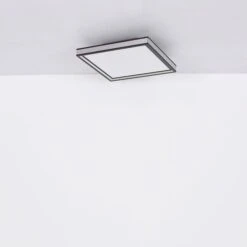 Sie besteht aus einem 60×60 cm großen Rahmen in der Farbe Schwarz mit Spiegelungen in Chrom. Im Rahmen befindet sich ein LED-Panel, welches ein 2700 Kelvin warmweißes bis hin zu 6500 Kelvin kaltweißes Licht ausstrahlt und somit für eine angenehme Stimmung sorgt. Mithilfe der inkludierten Fernbedienung können Sie die Leuchte dimmen und fixieren lassen oder auch in den Nachtmodus wechseln.