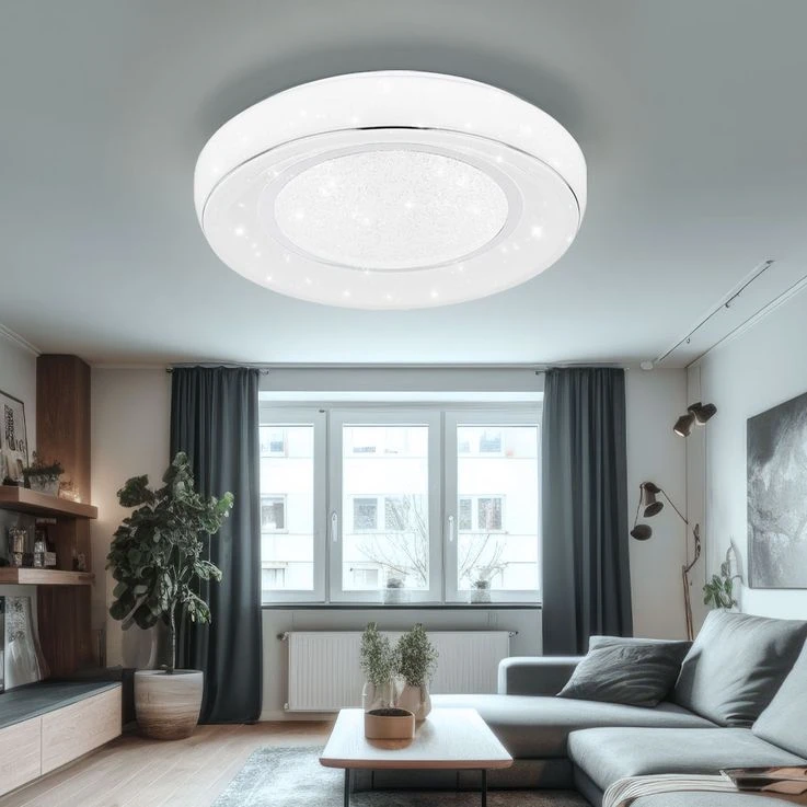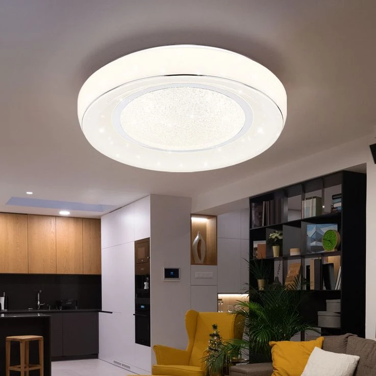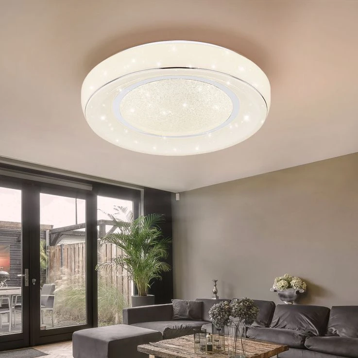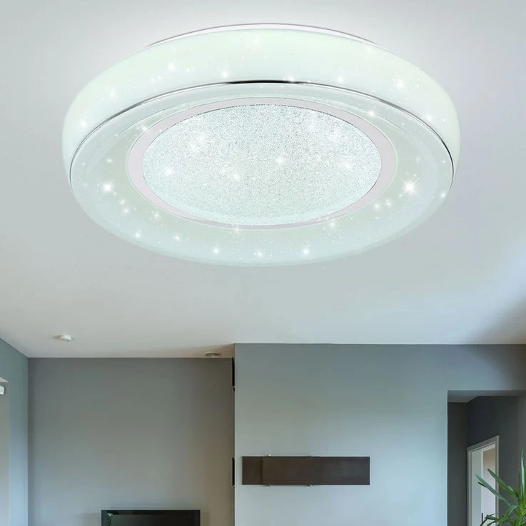 Die Deckenlampe lässt keine Wünsche offen. Der runde (Ø49cm) opale Lampenschirm sorgt mit den darin verfügbaren funkelnden Kunststoffkristallen für ein aufregenden Licht.