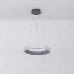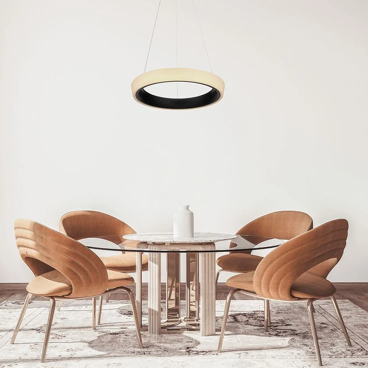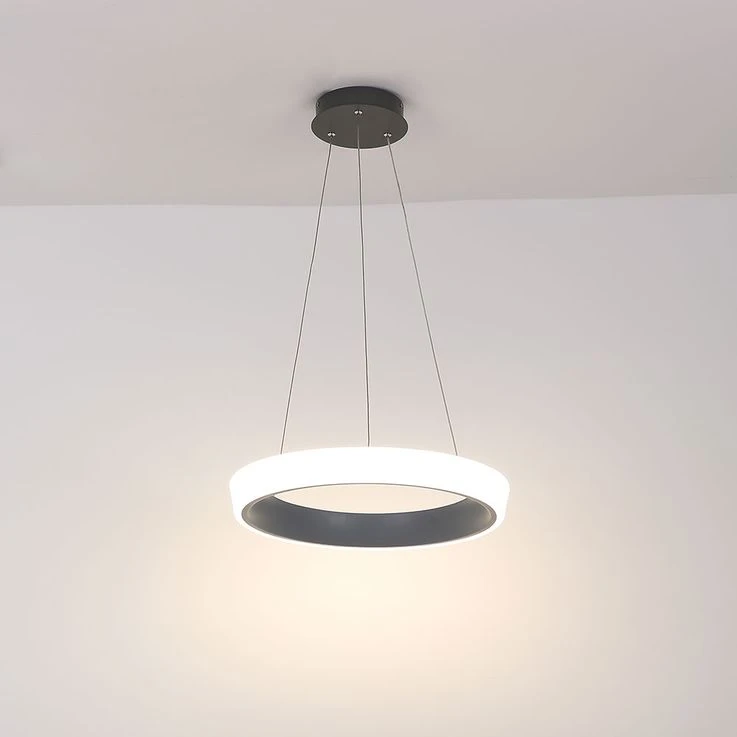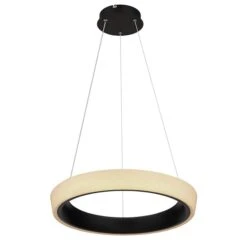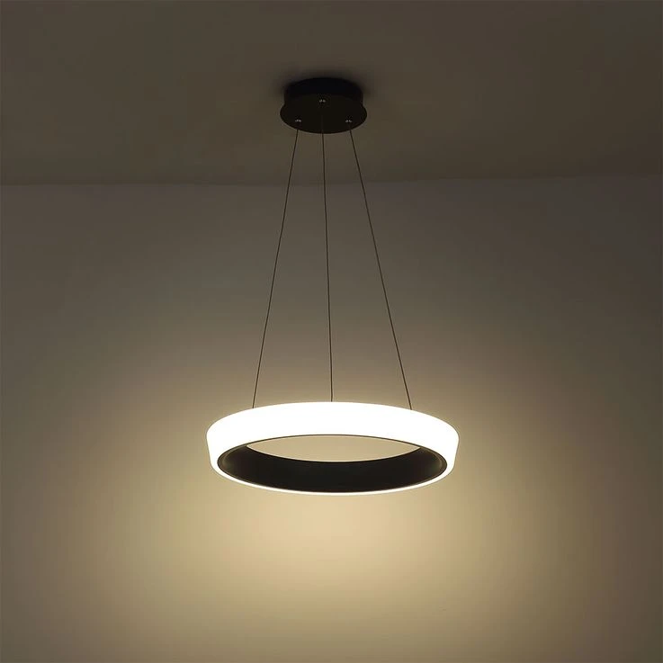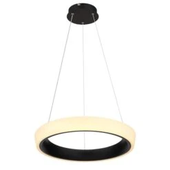 Diese tolle Hängeleuchte der Serie TABANO im modernen Stil erschafft ein angenehmes Wohlbefinden. Die ringförmige Hängeleuchte (Ø49,5 cm) in Schwarz mit integrierten LED Platinen hängt an 3 Seilen bis zu 1,2 m von der Decke. Die inkludierte Fernbedienung ermöglicht Ihnen, die Leuchte zwischen den Lichtstufen 3000 Kelvin warmweiß und 6500 Kelvin kaltweiß zu dimmen und Farben zu fixieren. Des Weiteren besitzt diese moderne Leuchte über eine Memory- und Nachtlichtfunktion. Setzen Sie Akzente.