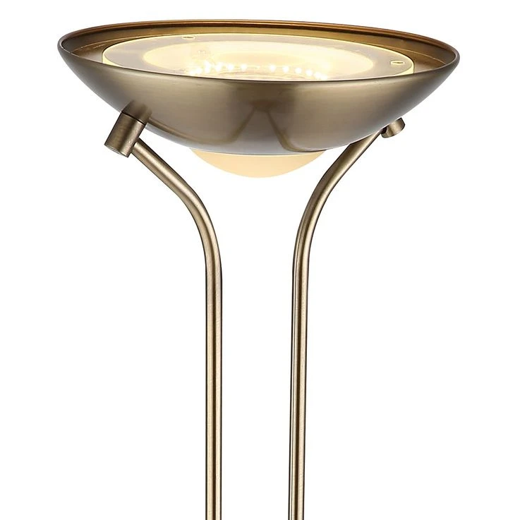 - DESIGN: Der aus Metall gefertigte Deckenfluter ist in einem altmessing Ton gehalten und mit gläsernen Lampenschirmen verziert.