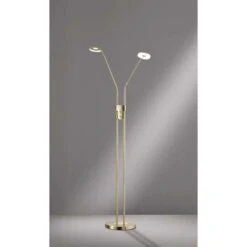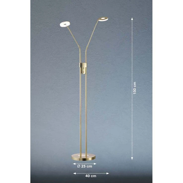 Suchen Sie noch nach einer gemütlichen Zimmerbeleuchtung für die Leseecke und als Alternative zum hellen Deckenlicht? Dann suchen Sie in Gedanken schonmal nach einen perfekten Platz für diese dekorative Stehleuchte. Auf den ersten Blick ist es eine schlichte Leuchte, doch auf den zweiten Blick verbergen sich in ihr zahlreiche Features. Lassen Sie uns diese doch im Folgenden gemeinsam entdecken. Leuchte mit beweglichen Armen Meistens ist das Licht im Raum doch nie da, wo es wirklich gebraucht wird. Dieses Problem löst die zweiflammige Stehleuchte Dent durch zwei bewegliche Arme. Sie können das Licht genau dort ausrichten, wo Sie es haben wollen. Stellen Sie die Leuchte zum Beispiel neben die Couch und richten Sie den Lichtkegel auf ihr Buch und wieder nach oben, wenn Sie den Raum allgemein beleuchten wollen. Zudem haben Sie die Möglichkeit, die einzelnen Lampen separat ein- und auszuschalten, je nachdem, ob Sie es heller oder schummriger haben möchten. Stehleuchte mit dimmbaren LED Die beiden Leuchtmittel im Fluter und in der Leselampe können separat voneinander an- und ausgeschaltet werden. Zudem ist das CCT Farbspektrum in 3 Stufen dimmbar. Über einen Tastdimmer können die Lampen sogar stufenlos gedimmt werden, damit Sie es sich zu jeder Tages- und Nachtzeit so richtig gemütlich machen können in Ihren Räumen. Zeitloses Design aus Metall in dezenten Farben Der Fuß der Leuchte und auch das Gestell sind aus Metall gefertigt. Die Farbe in Messingfarben matt und poliert fügt sich zeitlos-schön in jede Raumausstattung ein, so dass Sie nicht nur heute, sondern auch morgen noch Freude an dieser Leselampe haben. Darüber hinaus verzichtet die Leuchte auf alle überflüssigen Schnörkel und Detail. Wir freuen uns auf Ihre Bestellung und wünschen Ihnen viel Freude mit unserer Stehleuchte Dent.