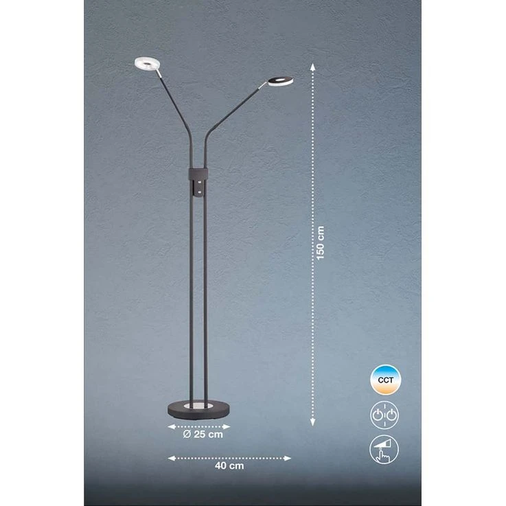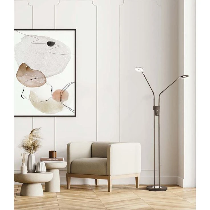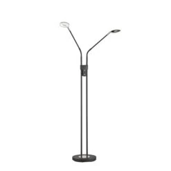 Suchen Sie noch nach einer gemütlichen Zimmerbeleuchtung für die Leseecke und als Alternative zum hellen Deckenlicht? Dann suchen Sie in Gedanken schonmal nach einen perfekten Platz für diese dekorative Stehleuchte. Auf den ersten Blick ist es eine schlichte Leuchte, doch auf den zweiten Blick verbergen sich in ihr zahlreiche Features. Lassen Sie uns diese doch im Folgenden gemeinsam entdecken. Leuchte mit beweglichen Armen Meistens ist das Licht im Raum doch nie da, wo es wirklich gebraucht wird. Dieses Problem löst die zweiflammige Stehleuchte Dent durch zwei bewegliche Arme. Sie können das Licht genau dort ausrichten, wo Sie es haben wollen. Stellen Sie die Leuchte zum Beispiel neben die Couch und richten Sie den Lichtkegel auf ihr Buch und wieder nach oben, wenn Sie den Raum allgemein beleuchten wollen. Zudem haben Sie die Möglichkeit, die einzelnen Lampen separat ein- und auszuschalten, je nachdem, ob Sie es heller oder schummriger haben möchten. Stehleuchte mit dimmbaren LED Die beiden Leuchtmittel im Fluter und in der Leselampe können separat voneinander an- und ausgeschaltet werden. Zudem sind sie in drei Stufen dimmbar. Über einen Tastdimmer können die Lampen sogar stufenlos gedimmt werden, damit Sie es sich zu jeder Tages- und Nachtzeit so richtig gemütlich machen können in Ihren Räumen. Zeitloses Design aus Metall in dezenten Farben Der Fuß der Leuchte und auch das Gestell sind aus Metall gefertigt. Die Farbe in Sandschwarz fügt sich zeitlos-schön in jede Raumausstattung ein, so dass Sie nicht nur heute, sondern auch morgen noch Freude an dieser Leselampe haben. Darüber hinaus verzichtet die Leuchte auf alle überflüssigen Schnörkel und Details. Wir freuen uns auf Ihre Bestellung und wünschen Ihnen viel Freude mit unserer Stehleuchte Dent.