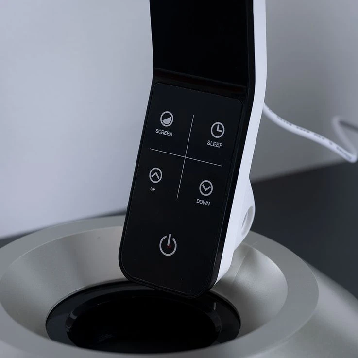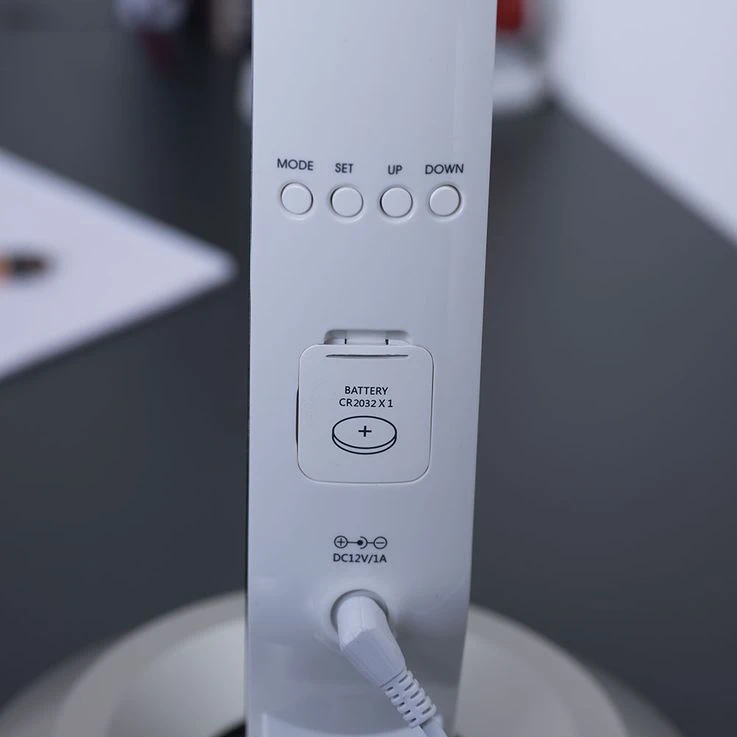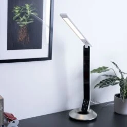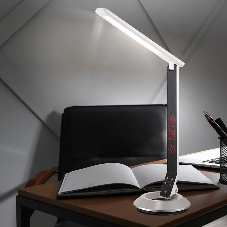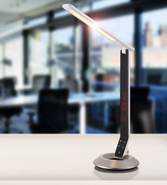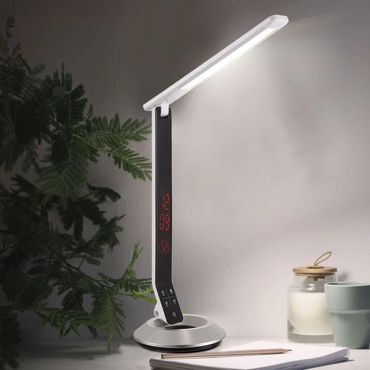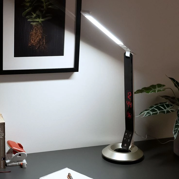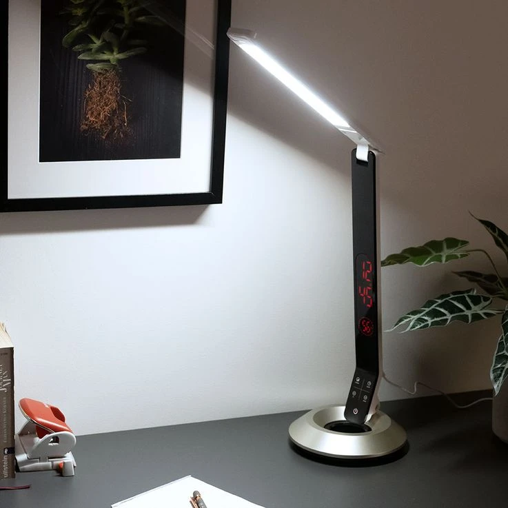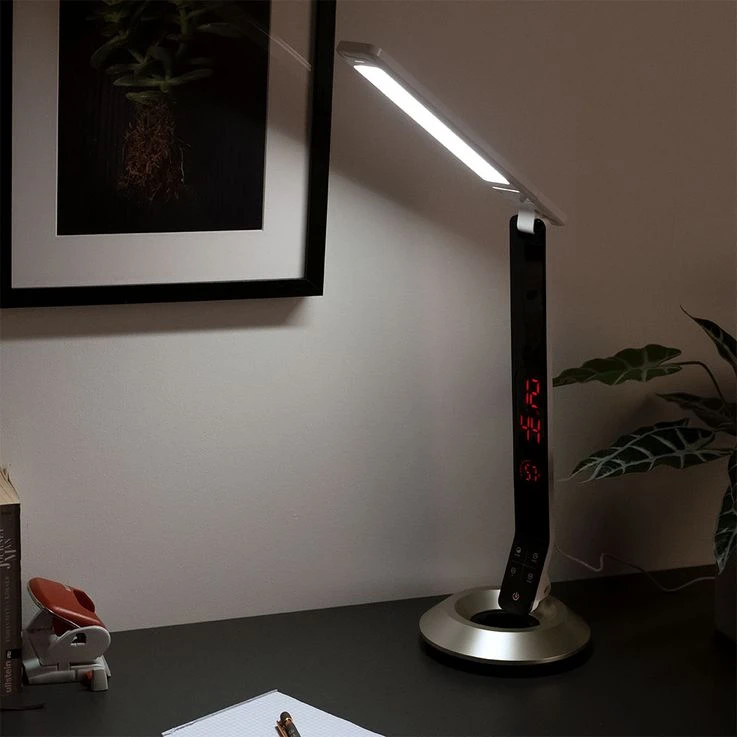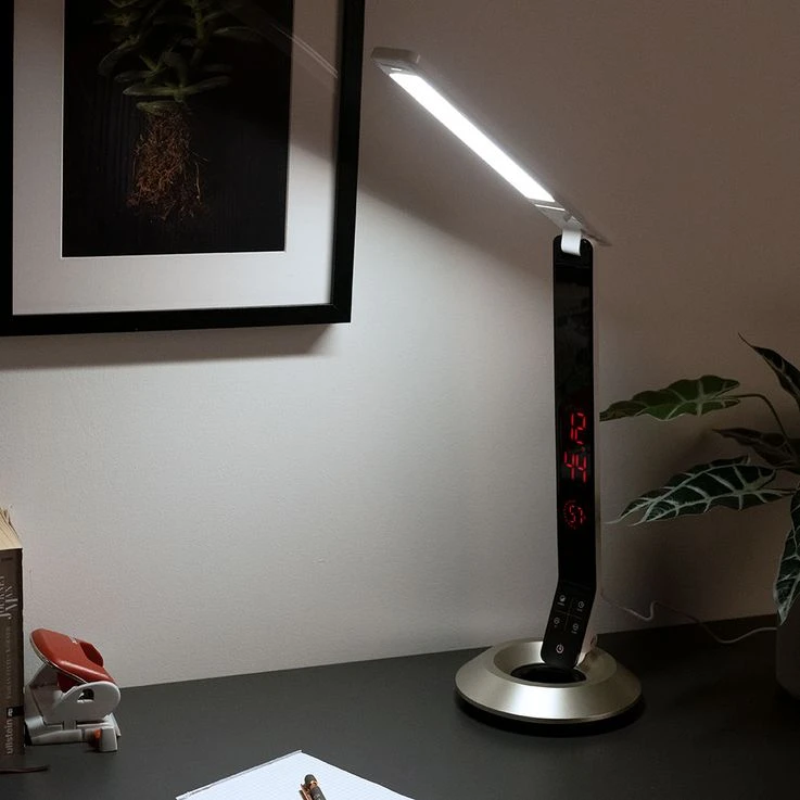 LED Tischleuchte mit Touchdimmer und Uhrzeit.