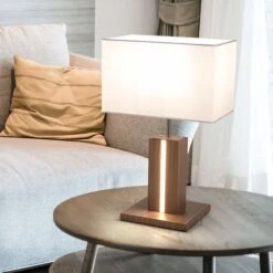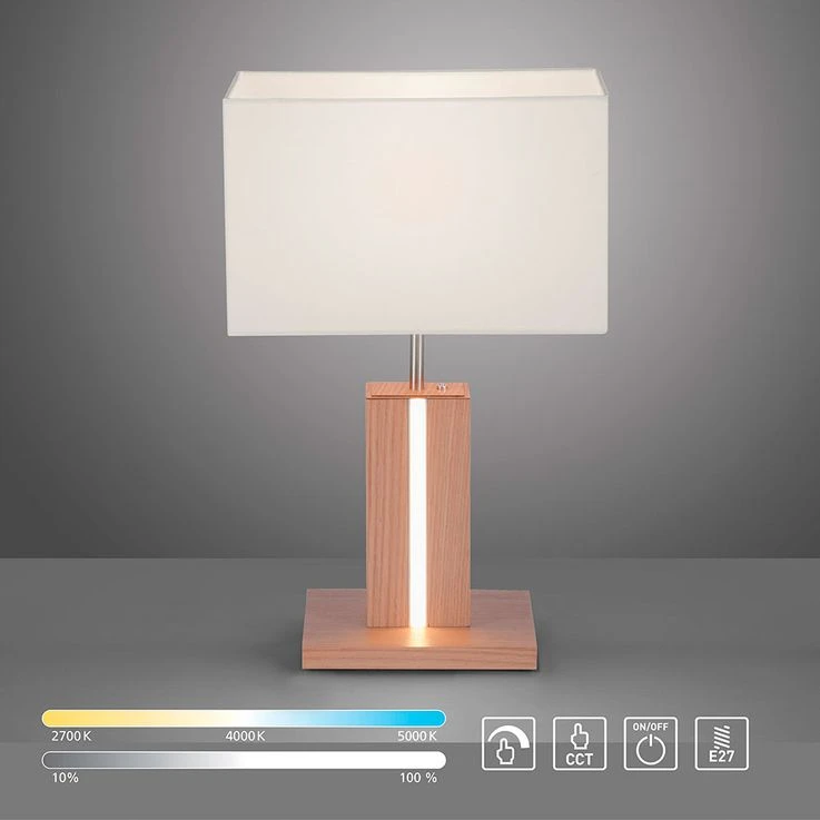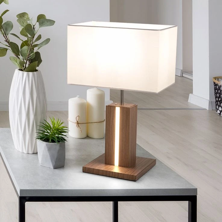 Die LED Tischleuchte überzeugt mit einer hübschen Kombination aus einem Sockel in Holzoptik und hellem Stofflampenschirm.