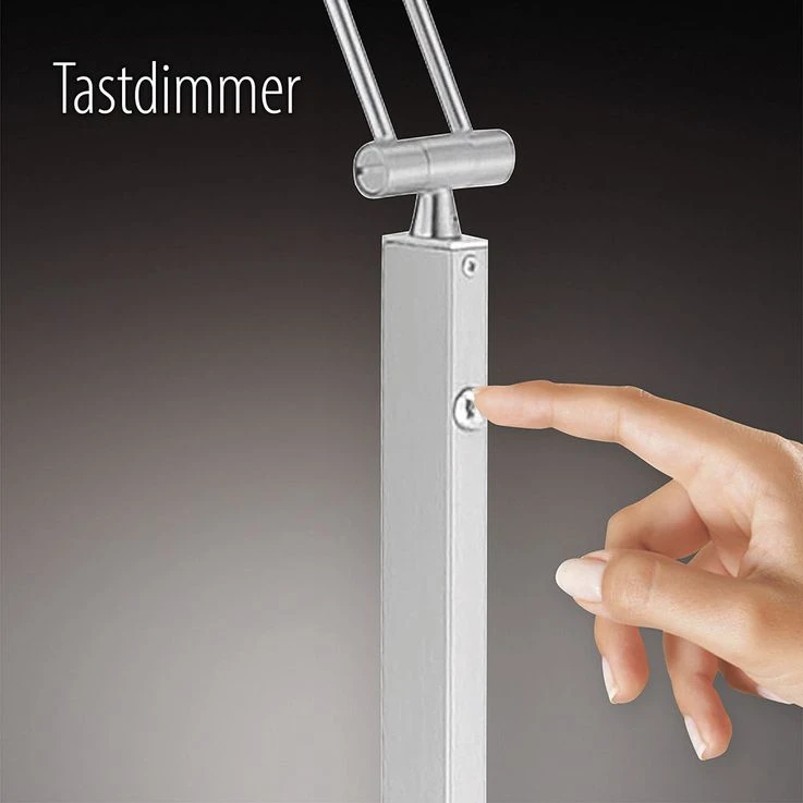 Die Tischleuchte wird mit einem festverbauten LED Leuchtmittel im Sockel der Leuchte geliefert, welches in einer Farbtemperatur von warmweiß (2700 Kelvin) bis tageslichtweiß (5000 Kelvin) verstellt werden kann. Die Regulierung der Farbeinstellung erfolgt über den Tastschalter. Ebenfalls kann die Leuchte über den Tastdimmer in der Lichtstärke gedimmt werden.