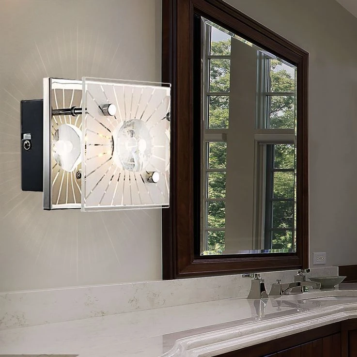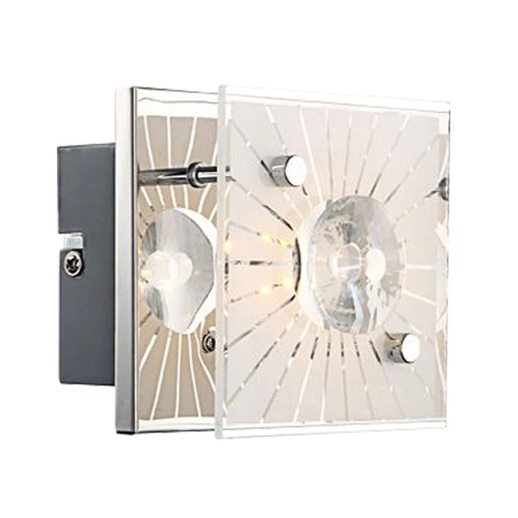 Diese moderne Wandleuchte ist aus Chrom gefertigt und wird von einer teils satinierten Glasscheibe mit Kristall vervollständigt.