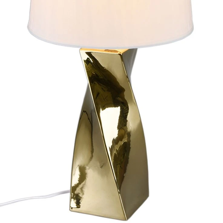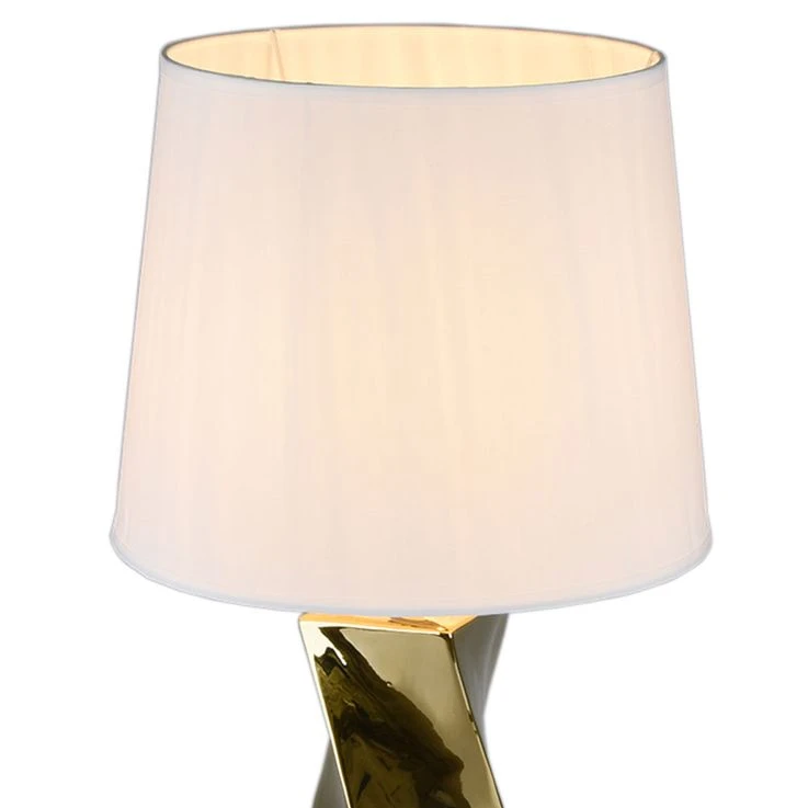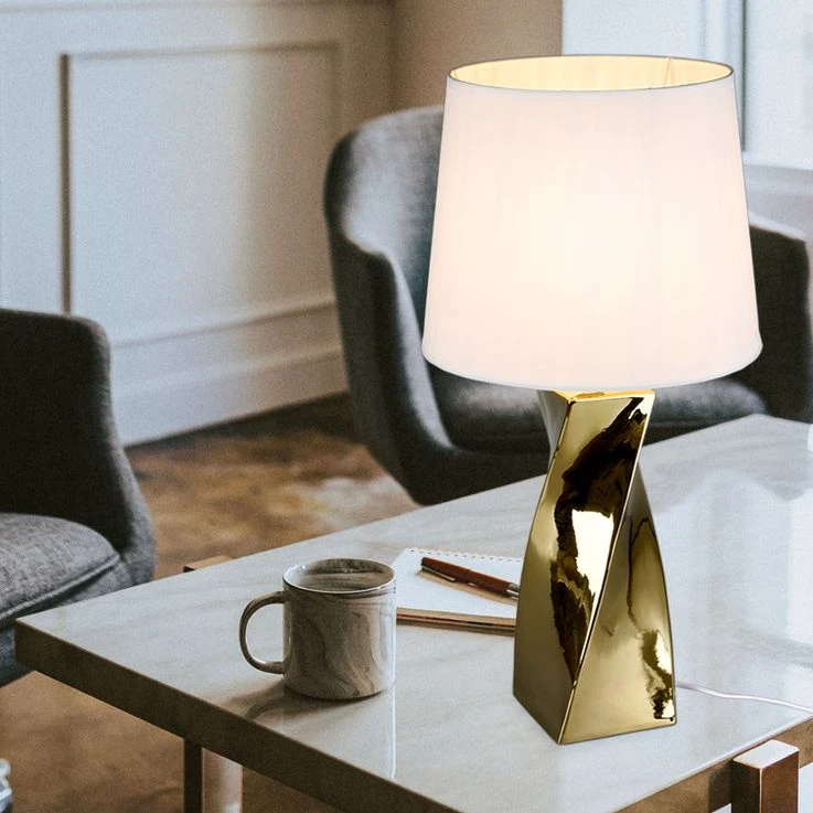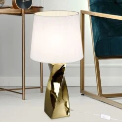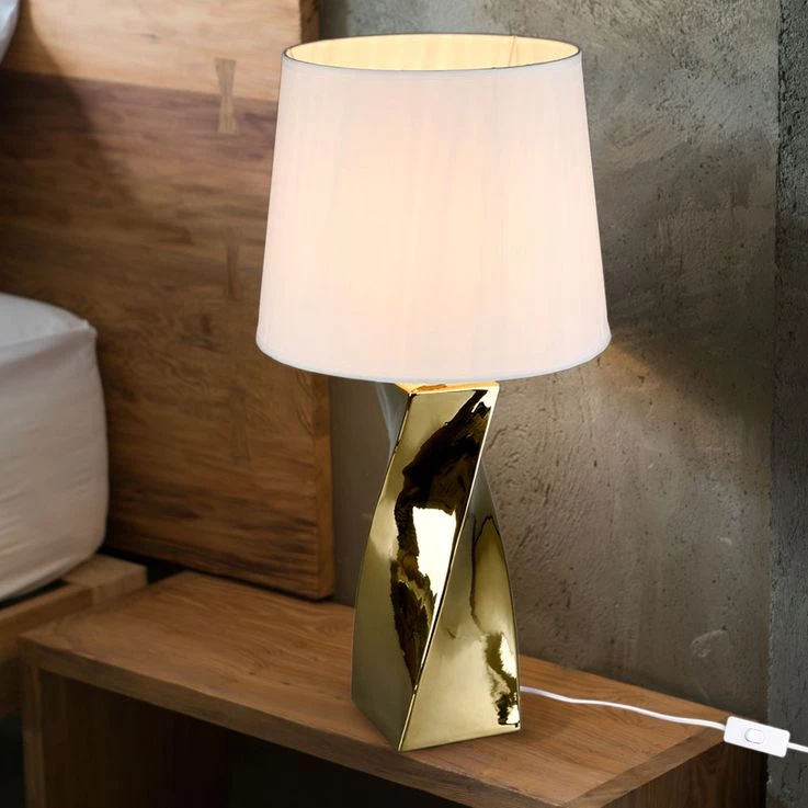 Die Tischleuchte ist eine Leuchte, die nicht übersehen wird. Der geschwungene Keramikfuß kommt in Kombination mit dem Stoffschirm in jedem Raum zur Geltung und erhellt diesen ebenfalls mit ihrem edlen Design. Die Leuchte wird über einen Schnurschalter betätigt. Die Höhe dieser Tischleuchte beträgt 68cm. Das grazile Design dieser Leuchte setzt sich zusammen aus goldenem Keramikfuß und weißem Stoffschirm.