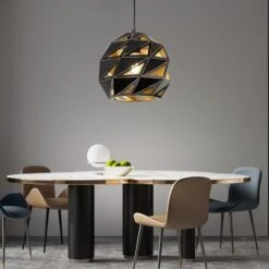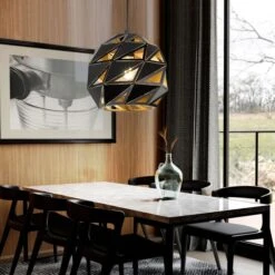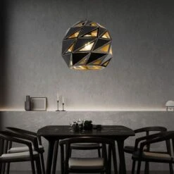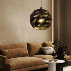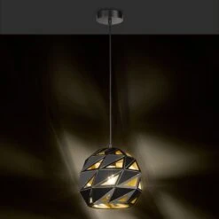 Die graphisch angeordneten Cut-Outs der Pendelleuchte JUBA nehmen nicht nur einen aktuell sehr beliebten Trend in der Mode auf – sie lassen auch einen Blick auf den innen angebrachten Goldton zu. Mit dem hübschen Lichtspiel sorgt die Pendelleuchte für eine angenehme Wohnraumatmosphäre.