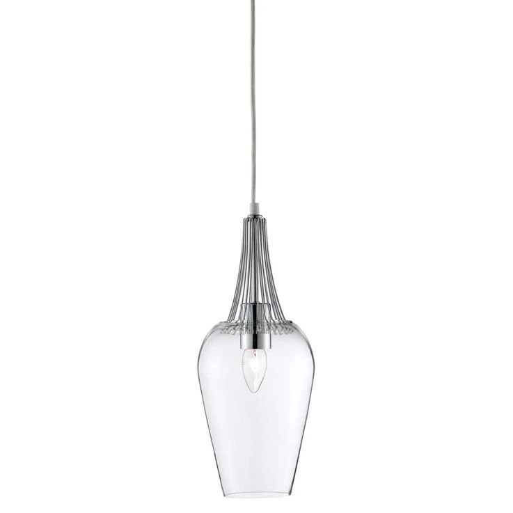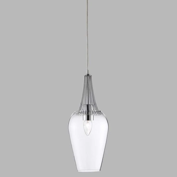 Diese Whisk Pendelleuchte mit Chromleiste und klarem Glasschirm ist klassisch und stilvoll. Der Schirm aus klarem Glas hat eine elegante Birnenform mit verchromten Schneebesen-artigen Drähten an der Oberseite und eine graue Deckenabhängung, die für unterschiedliche Deckenhöhen angepasst werden kann. Es erzeugt eine subtile Lichtquelle und ein entspanntes Ambiente.