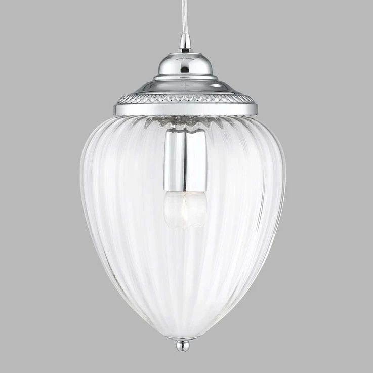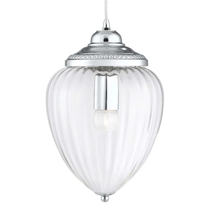 Diese verchromte Pendelleuchte mit klarer, gerippter Glaslaterne verleiht jedem Schlafzimmer, Wohnzimmer, Esszimmer oder Küche ein traditionelles Flair. Der formschöne gerippte Glasschirm verfügt über eine klassische Noppe an der Unterseite sowie eine verzierte Chrombeschichtung an der Oberseite, die zu einer Kabelaufhängung führt. Und das Licht kräuselt sich wunderschön durch den gerippten Glasschirm.