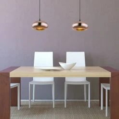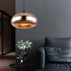 - MATERIAL/FARBE: Die Deckenhalterung der Innenleuchte ist aus schwarzem Metall gefertigt, während der runde Lampenschirm aus kupferfarbenem Glas besteht.