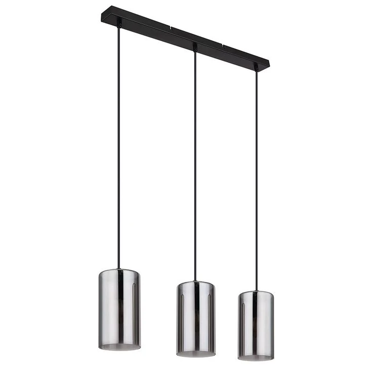 - MATERIAL/FARBE: Die Hängeleuchte wurde aus schwarz mattem Metall gefertigt, woran drei rauchfarbene Glasschirme befestigt sind.