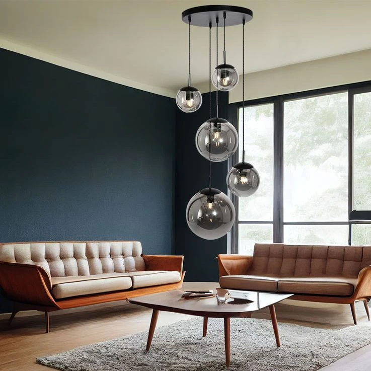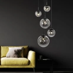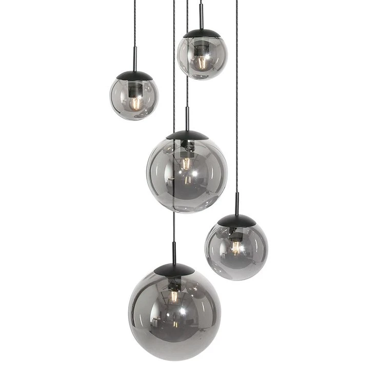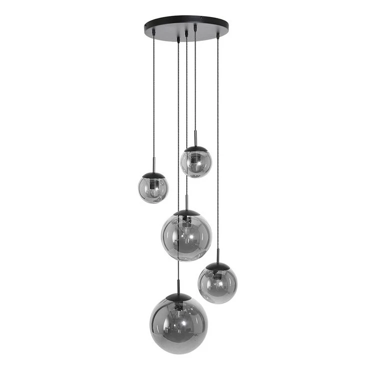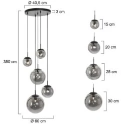 - METARIAL/FARBE: Die Pendellampe ist aus schwarz mattem Metall gefertigt. Die fünf unterschiedlich großen und kugelförmigen Lampenschirme bestehen aus Glas in edlem smoke Look.
