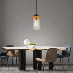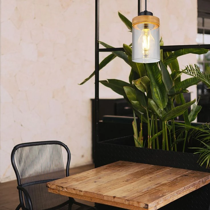 Ein moderner Hingucker für jede Ihrer Räume. Die wunderschöne Hängeleuchte mit zylinderförmigen rauchigem Glasschirm (Ø10cm) und Holzverzierungen besitzt eine E27 Fassung, welche an einem schwarz matten runden Sockel mit Kabel 1,5m von der Decke Hängt. Die E27 Fassung ermöglicht Ihnen die freie Wahl, bis zu einer maximalen Leistung von 60 Watt, Ihrer Leuchtmittel.Â